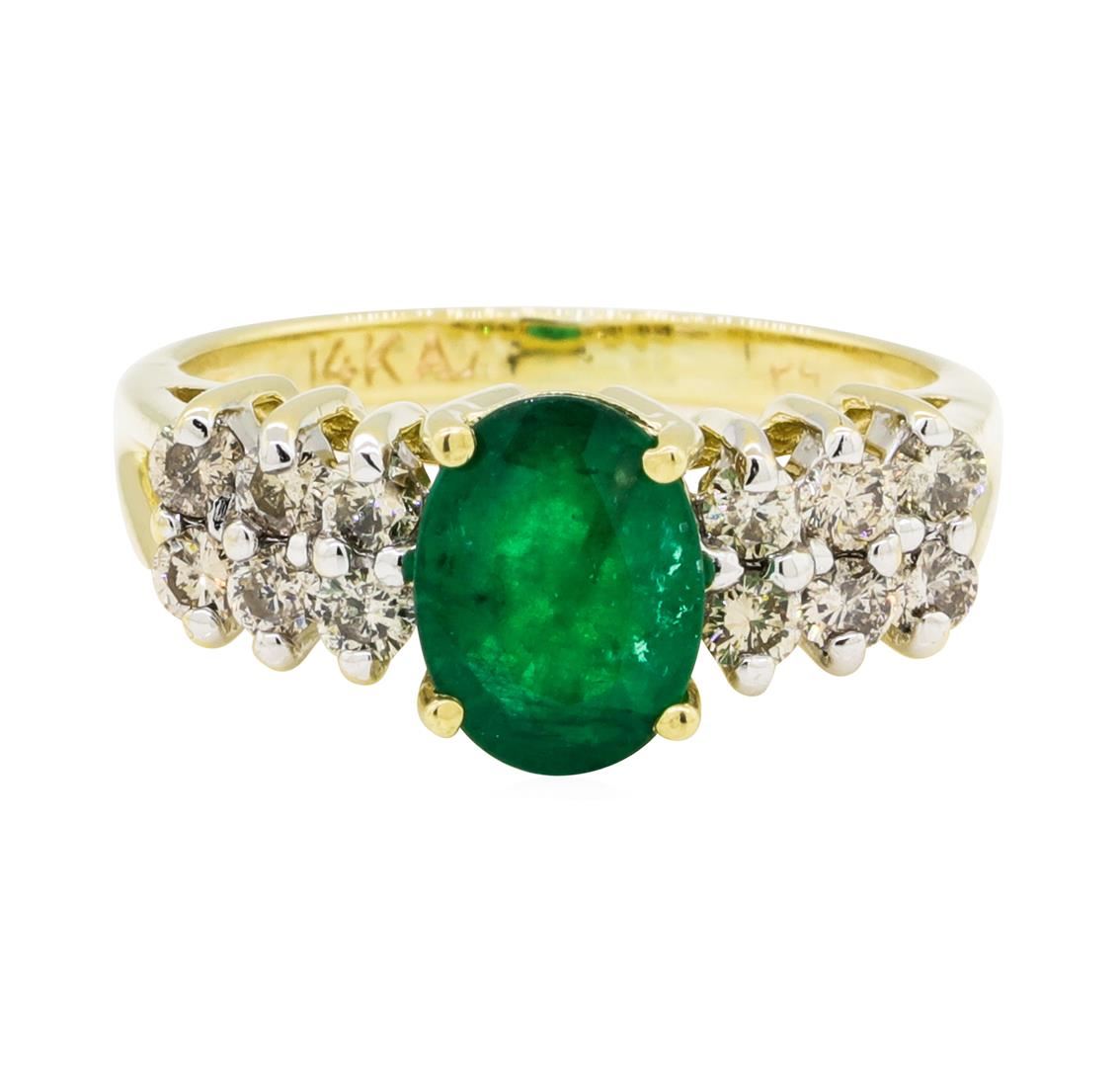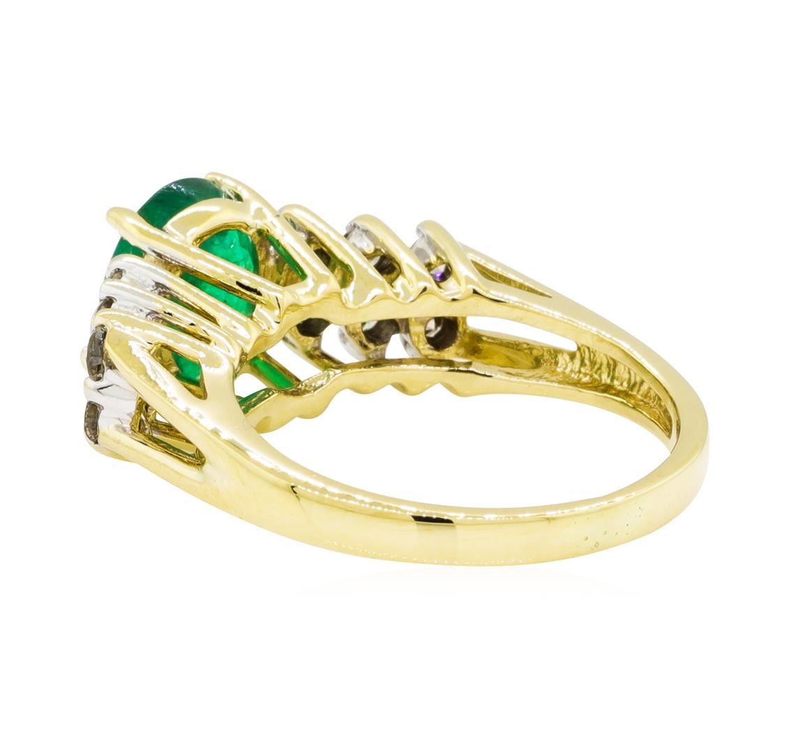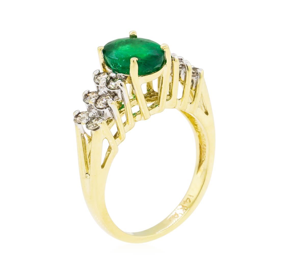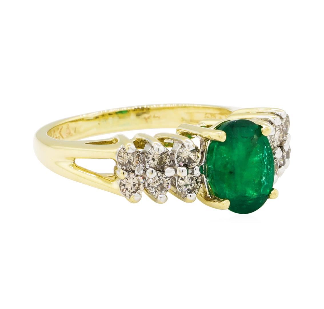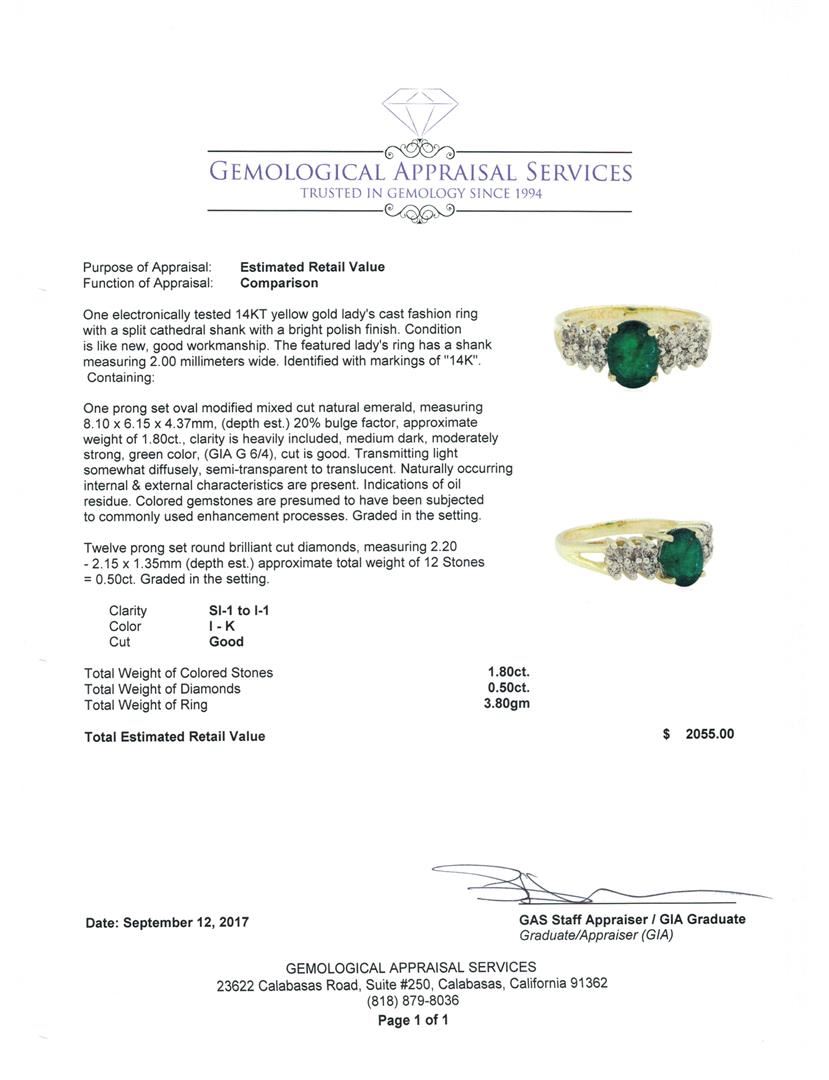 One electronically tested 14KT yellow gold lady's cast fashion ring with a split cathedral shank with a bright polish finish. The featured lady's ring has a shank measuring 2.00 millimeters wide. Identified with markings of '14K'. Condition is like new, good workmanship. Containing: One prong set oval modified mixed cut natural emerald, measuring 8.10 x 6.15 x 4.37mm, (depth est.) 20%. bulge factor, approximate weight of 1.80ct., clarity is heavily included, medium dark, moderately strong, green color, (GIA G 6/4), cut is good. Transmitting light somewhat diffusely, semi-transparent to translucent. Naturally occurring internal & external characteristics are present. Indications of oil residue. Colored gemstones are presumed to have been subjected to commonly used enhancement processes. Graded in the setting. Twelve prong set round brilliant cut diamonds, measuring 2.20 - 2.15 x 1.35mm (depth est.) approximate total weight of 12 Stones = 0.50ct. Graded in the setting. Color I - K Clarity SI-1 to I-1 Cut Good. Total Weight of Colored Stones 1.80ct.. Total Weight of Diamonds 0.50ct.. Total Weight of Ring 3.80gm GAS Appraised at $2055.00. GAS Appraised at $2,055.00.