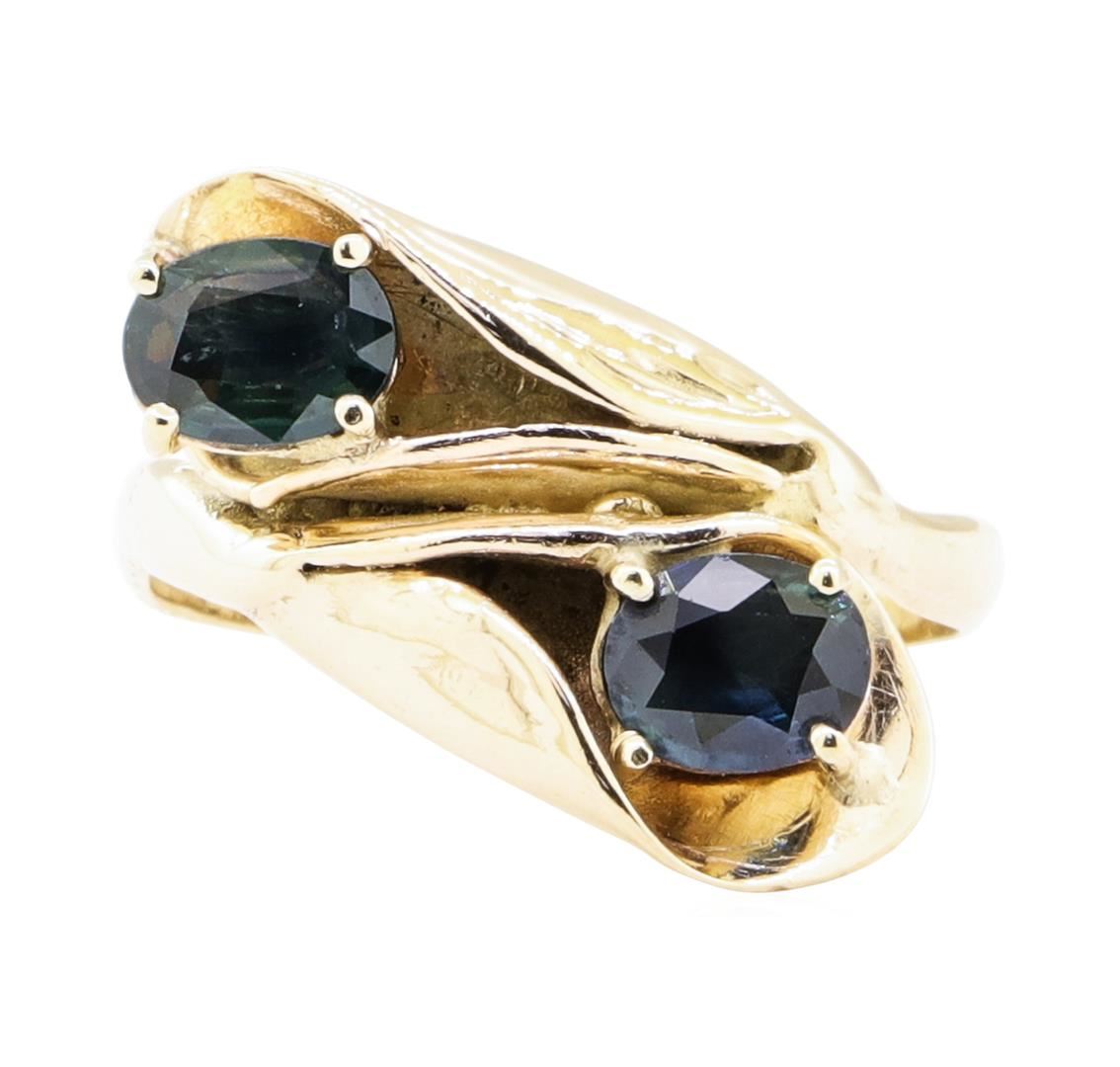 One ring with a bypass floral motif featuring: 14KT yellow gold weighing 4.6 grams containing two blue sapphires weighing 1.80 ctw.