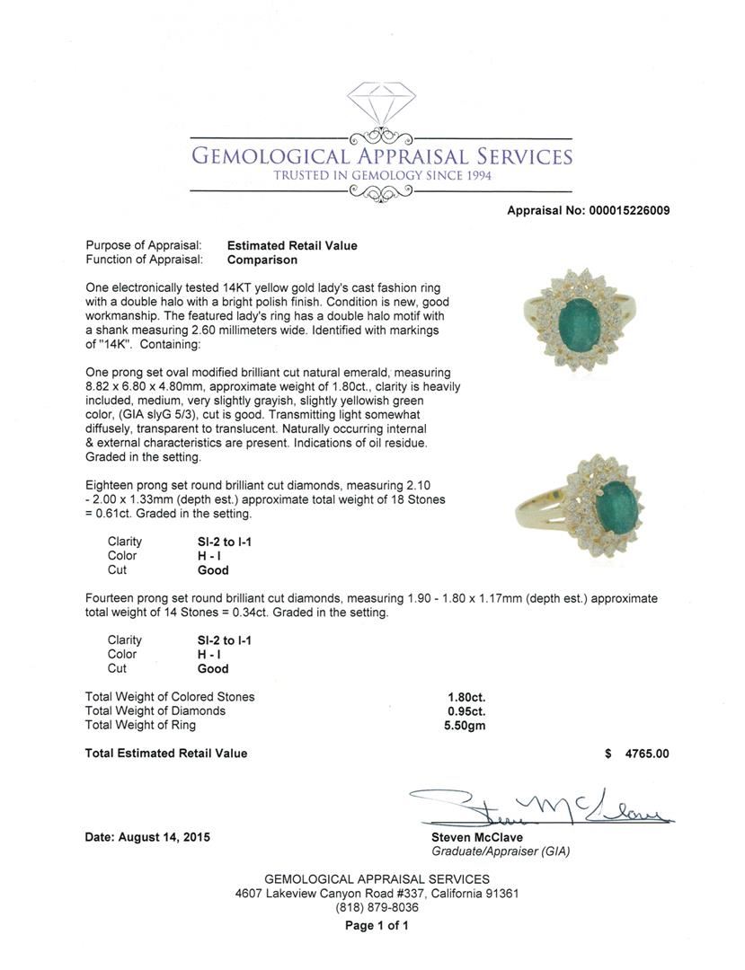One electronically tested 14KT yellow gold lady's cast fashion ring with a double halo with a bright polish finish. The featured lady's ring has a double halo motif with a shank measuring 2.60 millimeters wide. Identified with markings of "14K". Condition is new, good workmanship. Containing: One prong set oval modified brilliant cut natural emerald, measuring 8.82 x 6.80 x 4.80mm, approximate weight of 1.80ct., clarity is heavily included, medium, very slightly grayish, slightly yellowish green color, (GIA slyG 5/3), cut is good. Transmitting light somewhat diffusely, transparent to translucent. Naturally occurring internal & external characteristics are present. Indications of oil residue. Graded in the setting. Eighteen prong set round brilliant cut diamonds, measuring 2.10 - 2.00 x 1.33mm (depth est.) approximate total weight of 18 Stones = 0.61ct. Graded in the setting. Clarity: SI-2 to I-1. Color: H - I. Cut Good Fourteen prong set round brilliant cut diamonds, measuring 1.90 - 1.80 x 1.17mm (depth est.) approximate total weight of 14 Stones = 0.34ct. Graded in the setting. Clarity: SI-2 to I-1. Color: H - I. Cut Good. Total Weight of Colored Stones 1.80ct. Total Weight of Diamonds 0.95ct. Total Weight of Ring 5.50gm. GAS Appraised at $4,765.00.