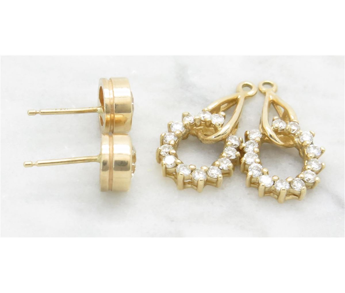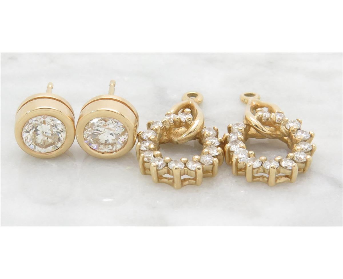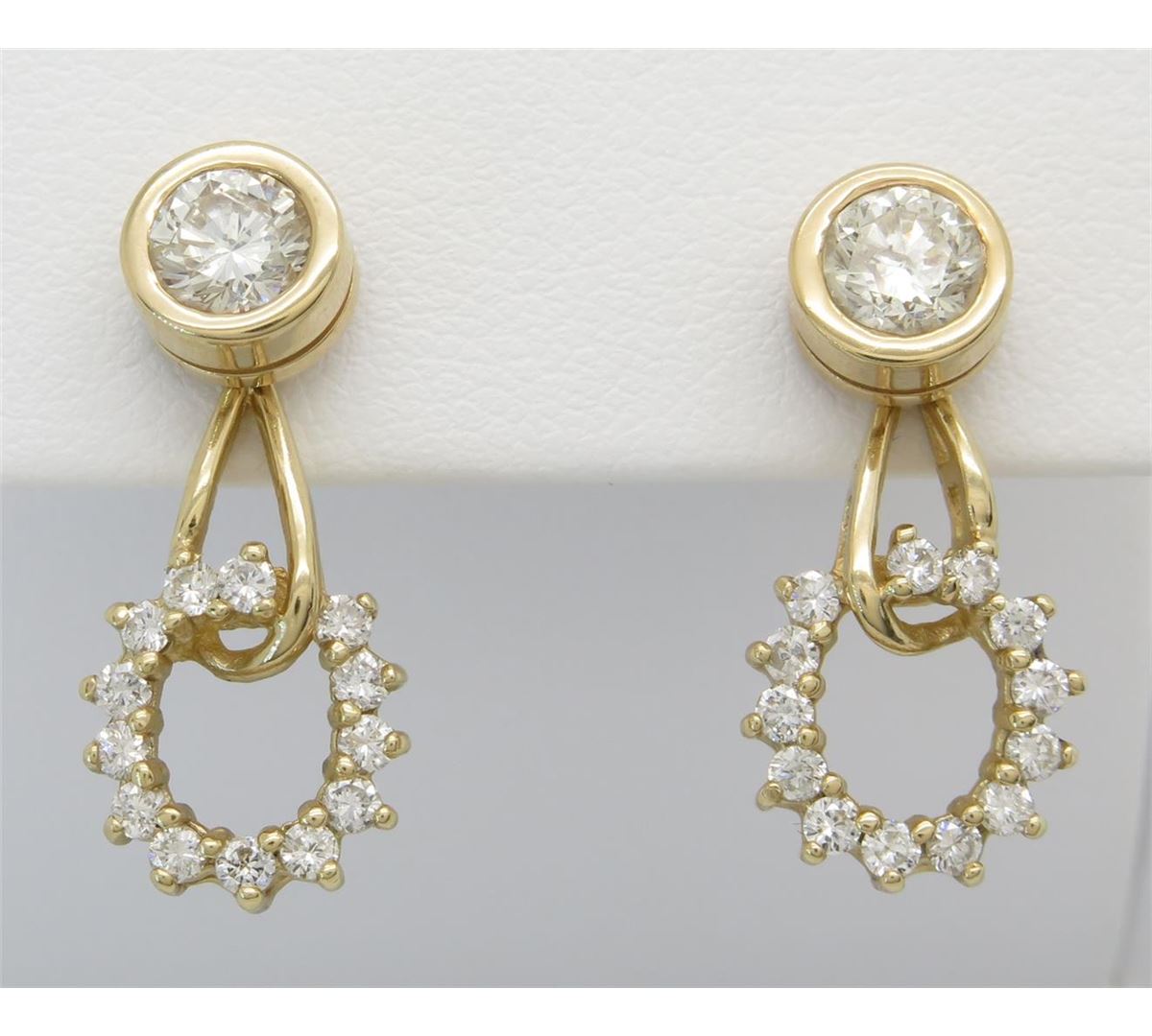One tested 14K yellow gold pair of diamond earrings. Containing: Two Round Brilliant Cut Diamonds. Approximate size: .70CT and .66CT. Clarity: I, Color: I-J. The jackets have 26 Round Brilliant Cut Diamonds. Approximate total diamond weight: 1.80CTW. Diamonds are graded in the mounting, unless otherwise stated. Weight: 4.9 grams. The earrings can be worn with or without the jackets.
