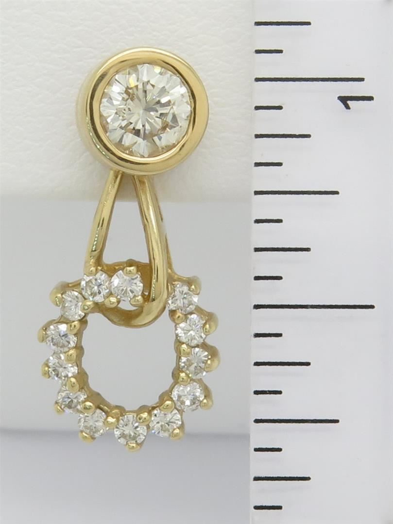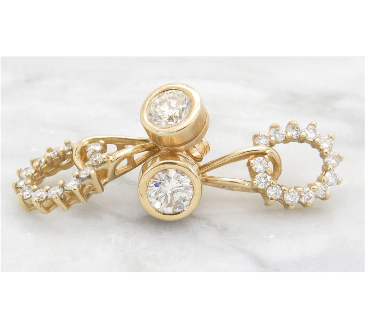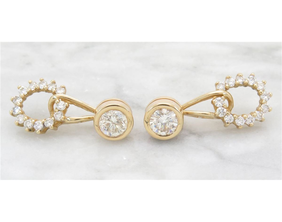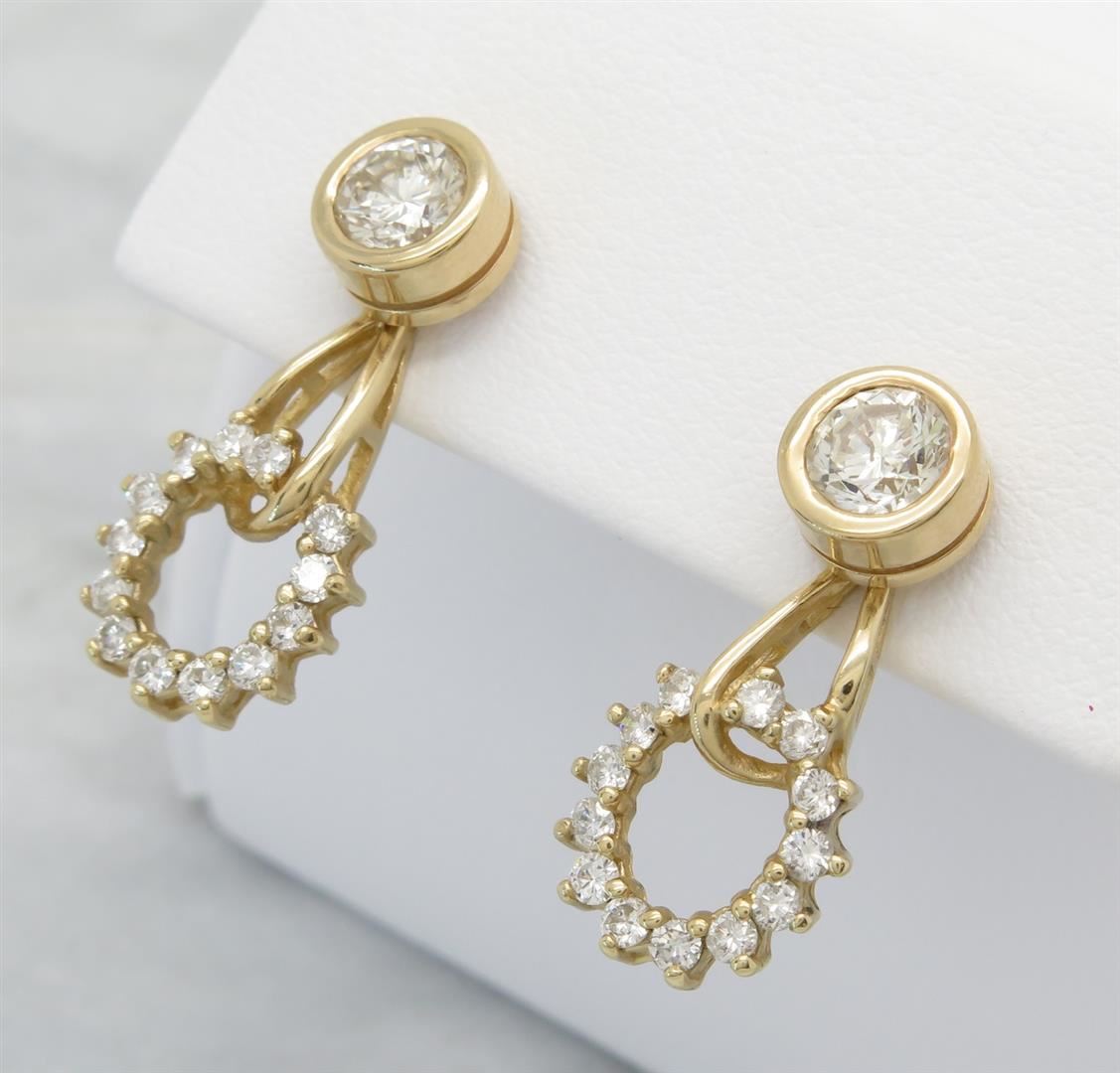One tested 14K yellow gold pair of diamond earrings. Containing: Two Round Brilliant Cut Diamonds. Approximate size: .70CT and .66CT. Clarity: I, Color: I-J. The jackets have 26 Round Brilliant Cut Diamonds. Approximate total diamond weight: 1.80CTW. Diamonds are graded in the mounting, unless otherwise stated. Weight: 4.9 grams. The earrings can be worn with or without the jackets.