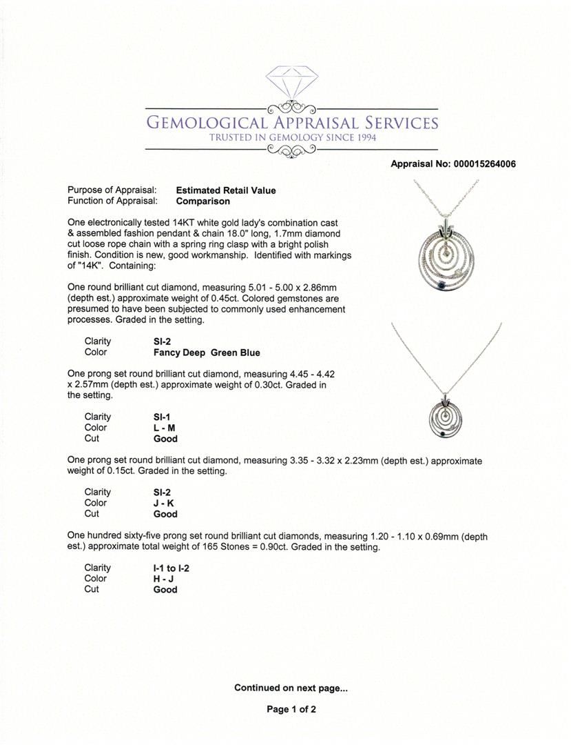 One electronically tested 14KT white gold lady's combination cast & assembled fashion pendant & chain 18.0" long, 1.7mm diamond cut loose rope chain with a spring ring clasp with a bright polish finish. Identified with markings of "14K". Condition is new, good workmanship. Containing: One round brilliant cut diamond, measuring 5.01 - 5.00 x 2.86mm (depth est.) approximate weight of 0.45ct. Colored gemstones are presumed to have been subjected to commonly used enhancement processes. Graded in the setting. Clarity: SI-2 One prong set round brilliant cut diamond, measuring 4.45 - 4.42 x 2.57mm (depth est.) approximate weight of 0.30ct. Graded in the setting. Clarity: SI-1. Color: L - M. Cut Good One prong set round brilliant cut diamond, measuring 3.35 - 3.32 x 2.23mm (depth est.) approximate weight of 0.15ct. Graded in the setting. Clarity: SI-2. Color: J - K. Cut Good One Hundred Sixty-Five prong set round brilliant cut diamonds, measuring 1.20 - 1.10 x 0.69mm (depth est.) approximate total weight of 165 Stones = 0.90ct. Graded in the setting. Clarity: I-1 to I-2. Color: H - Good. Total Weight of Diamonds 1.80ct. Total Weight of Pendant & Chain 11.60gm at $7255.00.. GAS Appraised at $7,255.00.