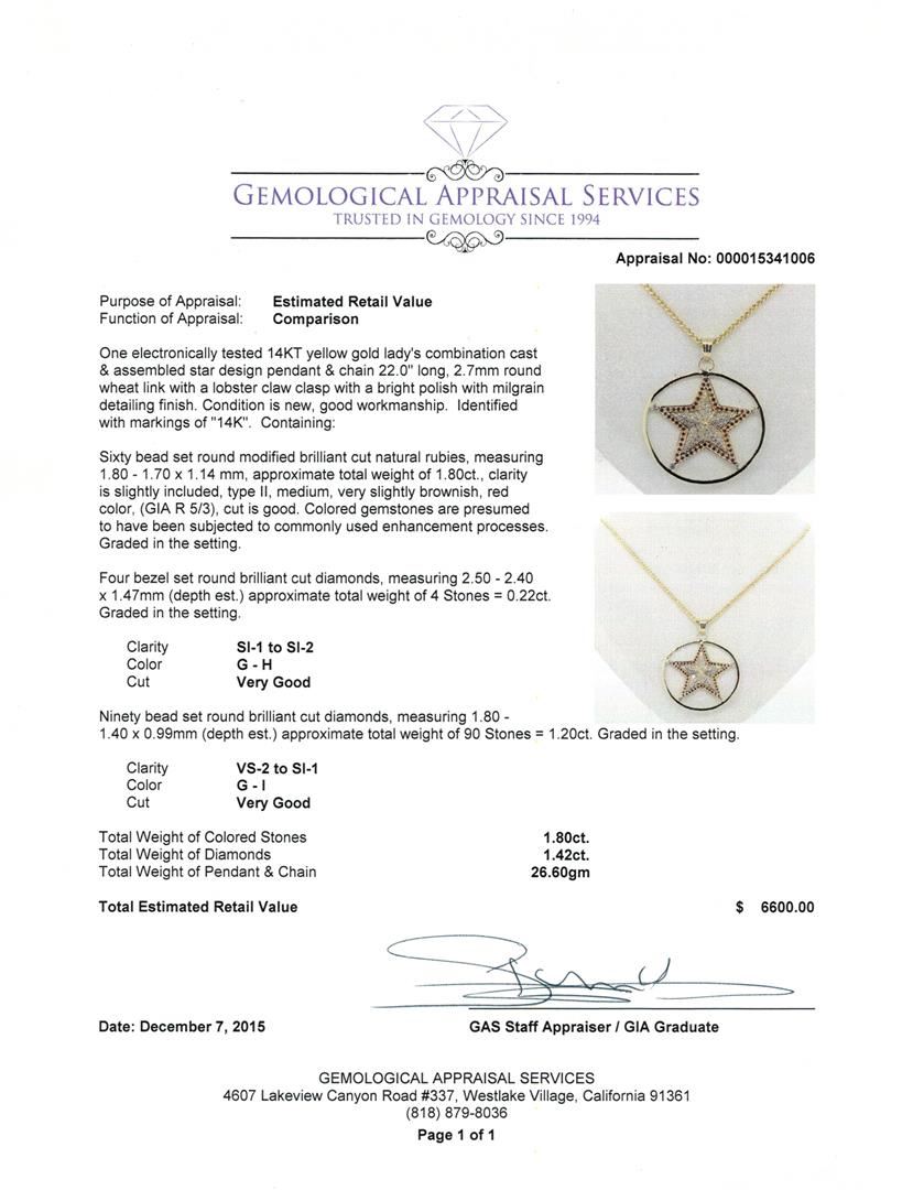 One electronically tested 14KT yellow gold lady's combination cast & assembled star design pendant & chain 22.0" long, 2.7mm round wheat link with a lobster claw clasp with a bright polish with milgrain detailing finish. Identified with markings of "14K". Condition is new, good workmanship. Containing: Sixty bead set round modified brilliant cut natural rubies, measuring 1.80 - 1.70 x 1.14 mm, approximate total weight of 1.80ct., clarity is slightly included, type II, medium, very slightly brownish, red color, (GIA R 5/3), cut is good. Colored gemstones are presumed to have been subjected to commonly used enhancement processes. Graded in the setting. Four bezel set round brilliant cut diamonds, measuring 2.50 - 2.40 x 1.47mm (depth est.) approximate total weight of 4 Stones = 0.22ct. Graded in the setting. Clarity: SI-1 to SI-2. Color: G - Very Good Ninety bead set round brilliant cut diamonds, measuring 1.80 - 1.40 x 0.99mm (depth est.) approximate total weight of 90 Stones = 1.20ct. Graded in the setting. Clarity: VS-2 to SI-1. Color: G - I. Cut Very Good. Total Weight of Colored Stones 1.80ct. Total Weight of Diamonds 1.42ct. Total Weight of Pendant & Chain 26.60gm. GAS Appraised at $6,600.00.
