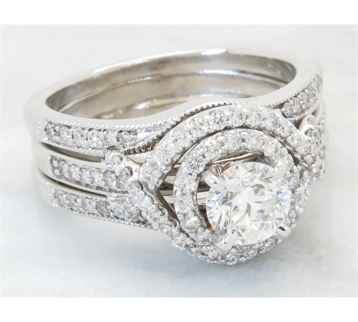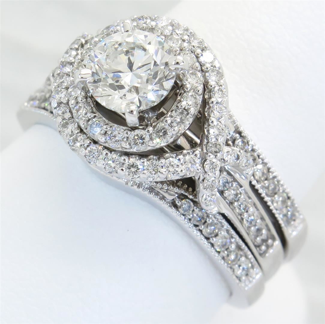 One tested 14K white gold diamond ring. Containing: One Round Brilliant Cut Diamond. Approximate size: .85CT, Clarity: I, Color: F-G. 96 Round Brilliant Cut Diamonds. Approximate total diamond weight: 1.81CTW. All diamonds are graded in the mounting unless otherwise stated. Weight of ring: 10.8 grams, Size: 8.25.