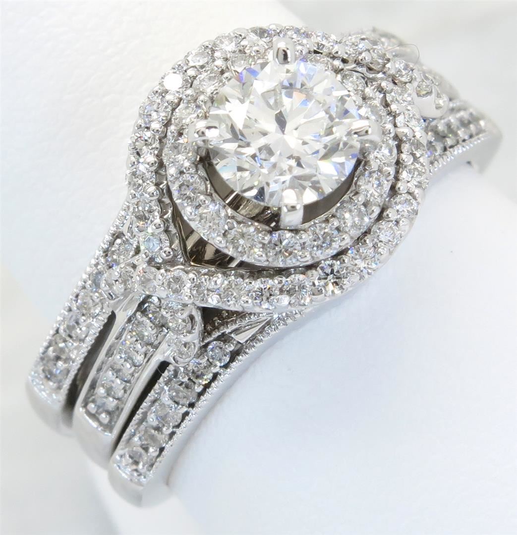 One tested 14K white gold diamond ring. Containing: One Round Brilliant Cut Diamond. Approximate size: .85CT, Clarity: I, Color: F-G. 96 Round Brilliant Cut Diamonds. Approximate total diamond weight: 1.81CTW. All diamonds are graded in the mounting unless otherwise stated. Weight of ring: 10.8 grams, Size: 8.25.
