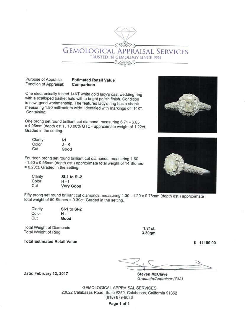 One electronically tested 14KT white gold lady's cast wedding ring with a scalloped basket halo with a bright polish finish. The featured lady's ring has a shank measuring 1.90 millimeters wide. Identified with markings of '14K'. Condition is new, good workmanship. Containing: One prong set round brilliant cut diamond, measuring 6.71 - 6.65 x 4.06mm (depth est.) , 10.00.%. GTCF approximate weight of 1.22ct. Graded in the setting. Clarity I-1. Color: J - K Cut Good Fourteen prong set round brilliant cut diamonds, measuring 1.60 - 1.50 x 0.96mm (depth est.) approximate total weight of 14 Stones = 0.20ct. Graded in the setting. Clarity SI-1 to SI-2. Color: H - I Cut Very Good Fifty prong set round brilliant cut diamonds, measuring 1.30 - 1.20 x 0.78mm (depth est.) approximate total weight of 50 Stones = 0.39ct. Graded in the setting. Clarity SI-1 to SI-2. Color: H - I Cut Good. Total Weight of Diamonds 1.81ct.. Total Weight of Ring 3.30gm. GAS Appraised at $11,180.00.