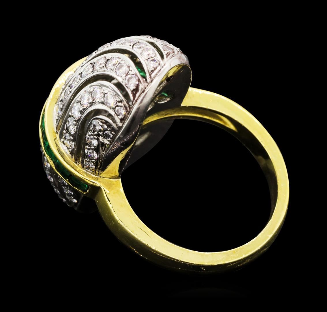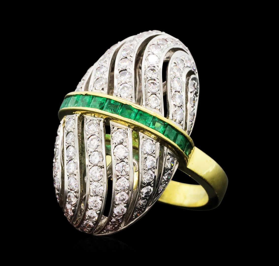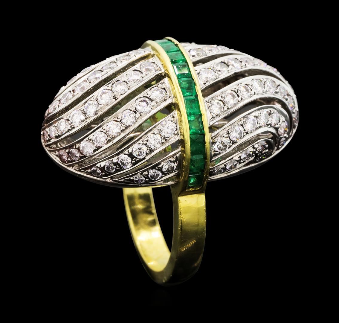 One electronically tested 18KT yellow and white gold lady's combination cast & assembled fashion dome style ring with a bright polish finish. The featured lady's ring has a shank measuring 2.92 millimeters wide. Condition is used, good workmanship. Containing: Fourteen channel set square standard step cut natural emeralds, measuring 2.10 x 1.90 x 1.30mm, (depth est.) approximate total weight of 0.56ct., clarity is moderately included, medium dark, moderately strong, green color, (GIA G 6/4), cut is good. Transmitting light somewhat diffusely, transparent to translucent. Indications of oil residue. Naturally occurring internal & external characteristics are present. Colored gemstones are presumed to have been subjected to commonly used enhancement processes. Graded in the setting. Seventy bead set round brilliant cut diamonds, measuring 1.90 - 1.70 x 1.12mm (depth est.) approximate total weight of 70 Stones = 1.50ct. Graded in the setting. Color G - H Clarity VS-2 to SI-1 Cut Very Good Twenty-Two bead set round brilliant cut diamonds, measuring 1.60 - 1.50 x 0.96mm (depth est.) approximate total weight of 22 Stones = 0.31ct. Graded in the setting. Color G - H Clarity VS-2 to SI-1 Cut Very Good. Total Weight of Colored Stones 0.56ct.. Total Weight of Diamonds 1.81ct.. Total Weight of Ring 13.70gm GAS Appraised at $7,500.00.