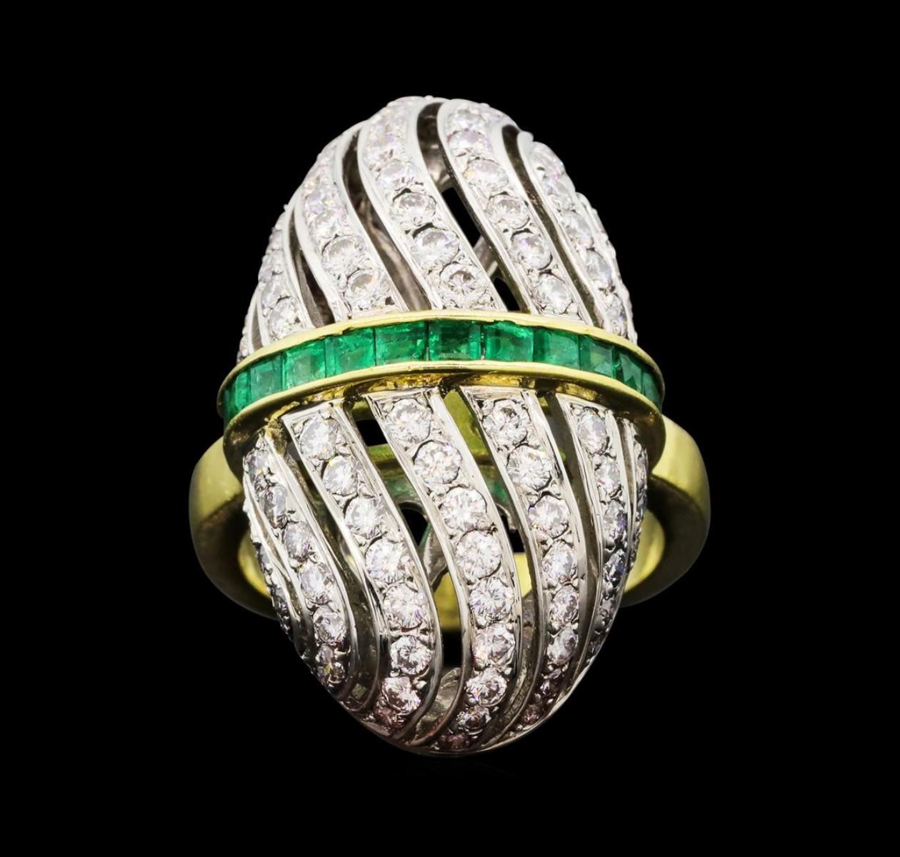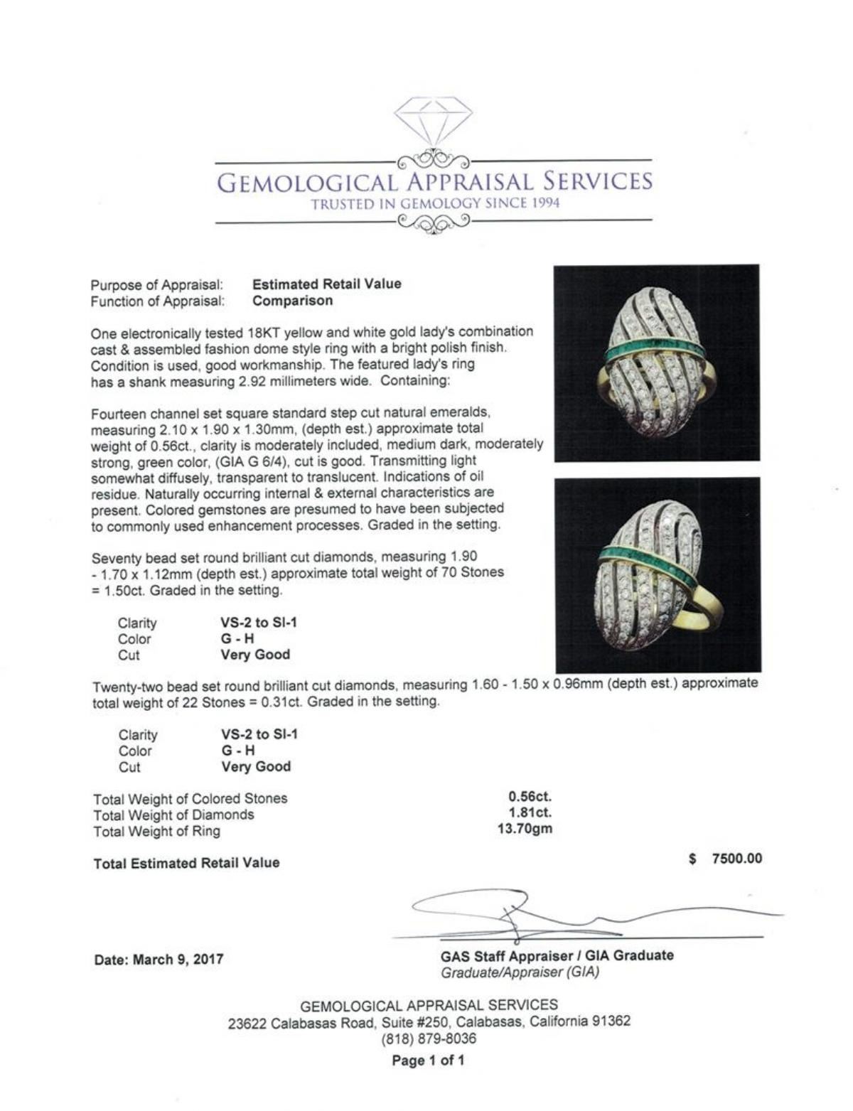One electronically tested 18KT yellow and white gold lady's combination cast & assembled fashion dome style ring with a bright polish finish. The featured lady's ring has a shank measuring 2.92 millimeters wide. Condition is used, good workmanship. Containing: Fourteen channel set square standard step cut natural emeralds, measuring 2.10 x 1.90 x 1.30mm, (depth est.) approximate total weight of 0.56ct., clarity is moderately included, medium dark, moderately strong, green color, (GIA G 6/4), cut is good. Transmitting light somewhat diffusely, transparent to translucent. Indications of oil residue. Naturally occurring internal & external characteristics are present. Colored gemstones are presumed to have been subjected to commonly used enhancement processes. Graded in the setting. Seventy bead set round brilliant cut diamonds, measuring 1.90 - 1.70 x 1.12mm (depth est.) approximate total weight of 70 Stones = 1.50ct. Graded in the setting. Color G - H Clarity VS-2 to SI-1 Cut Very Good Twenty-Two bead set round brilliant cut diamonds, measuring 1.60 - 1.50 x 0.96mm (depth est.) approximate total weight of 22 Stones = 0.31ct. Graded in the setting. Color G - H Clarity VS-2 to SI-1 Cut Very Good. Total Weight of Colored Stones 0.56ct.. Total Weight of Diamonds 1.81ct.. Total Weight of Ring 13.70gm GAS Appraised at $7,500.00.