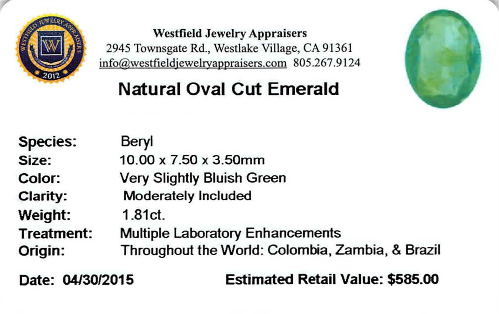 One oval mixed cut natural emerald exact weight 1.81ct., clarity is moderately included, type III, medium dark, very slightly grayish, very slightly bluish green color, (GIA vslbG 6/3), cut is good. Westfield Appraised at $585.00.