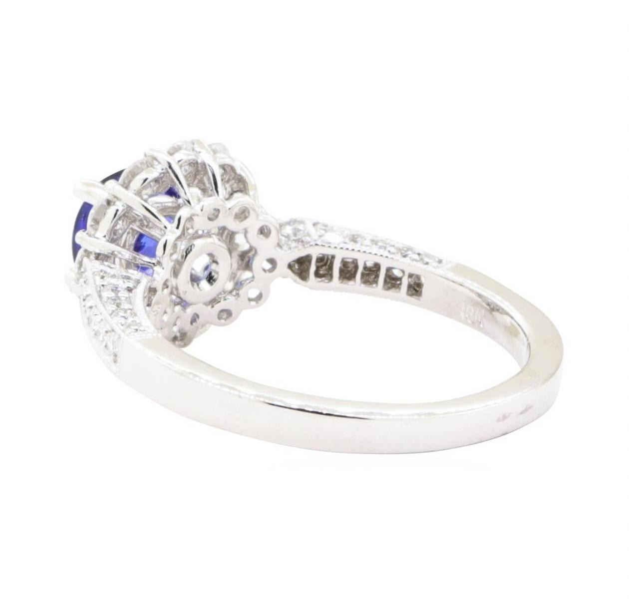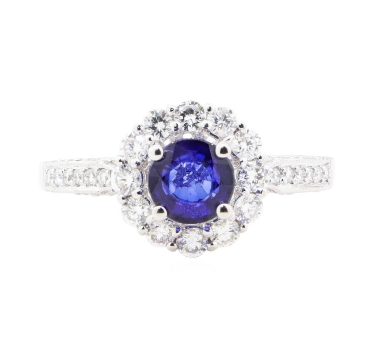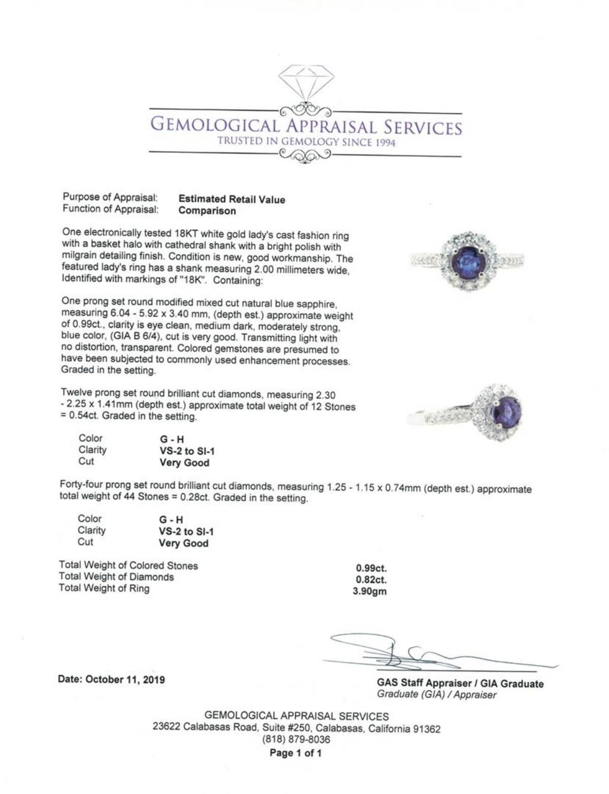 One electronically tested 18KT white gold lady's cast fashion ring with a basket halo with cathedral shank with a bright polish with milgrain detailing finish. The featured lady's ring has a shank measuring 2.00 millimeters wide, Identified with markings of '18K'. Condition is new, good workmanship. Containing: One prong set round modified mixed cut natural blue sapphire, measuring 6.04 - 5.92 x 3.40 mm, (depth est.) approximate weight of 0.99ct., clarity is eye clean, medium dark, moderately strong, blue color, (GIA B 6/4), cut is very good. Transmitting light with no distortion, transparent. Colored gemstones are presumed to have been subjected to commonly used enhancement processes. Graded in the setting. Twelve prong set round brilliant cut diamonds, measuring 2.30 - 2.25 x 1.41mm (depth est.) approximate total weight of 12 Stones = 0.54ct. Graded in the setting. Color G - H Clarity VS-2 to SI-1 Cut Very Good Forty-Four prong set round brilliant cut diamonds, measuring 1.25 - 1.15 x 0.74mm (depth est.) approximate total weight of 44 Stones = 0.28ct. Graded in the setting. Color G - H Clarity VS-2 to SI-1 Cut Very Good. Total Weight of Colored Stones 0.99ct.. Total Weight of Diamonds 0.82ct.. Total Weight of Ring 3.90gm GAS Appraised at $4360.00. GAS Appraised.