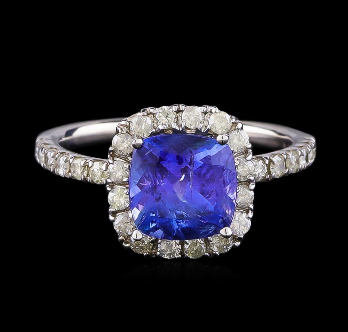 One electronically tested 14KT white gold ladies cast tanzanite and diamond ring with a bright polish finish. The featured tanzanite is set within a diamond bezel supported by diamond set shoulders, completed by a one and one-half millimeter wide band. Identified with markings of "K14". Condition is new, good workmanship. Containing: One prong set square cushion mixed cut natural tanzanite approximate weight of 1.81ct., clarity is moderately included, type I, medium, very slightly grayish, bluish violet color, (GIA bV 5/3), cut is good. Transmitting light with a minimum of distortion, transparent. Naturally occurring internal & external characteristics are present. Graded in the setting. Tanzanite is a very rare gemstone that is only found in the country of Tanzania. Originally discovered in 1967. Tiffany & Company, named the stone Tanzanite. It is found in the Usumburu Mountains that border the Umba Valley of northern Tanzania. Tanzanite occurs in gray, brown, violet, blue, reddish-purple, & green. The gem is interesting because of its exceptional pleochroism. Rotated in different directions a tanzanite will exhibit multiple changes of color. Tanzanite has a low tolerance to ultrasonic cleaning, and should not be cleaned using this method. Thirty prong set round brilliant cut diamonds approximate total weight of 30 Stones = 0.45ct. Graded in the setting. Clarity: I-2 to I-3. Color: H - J. Total Weight of Colored Stones 1.81ct. Total Weight of Diamonds 0.45ct. Total Weight of Ring 2.55gm. AIG Appraised at $3,895.00.