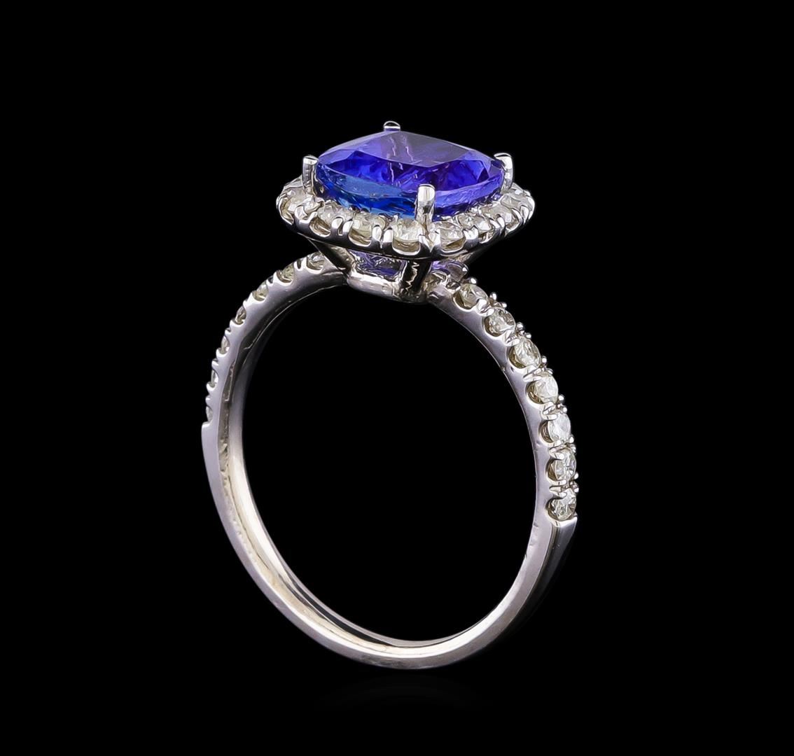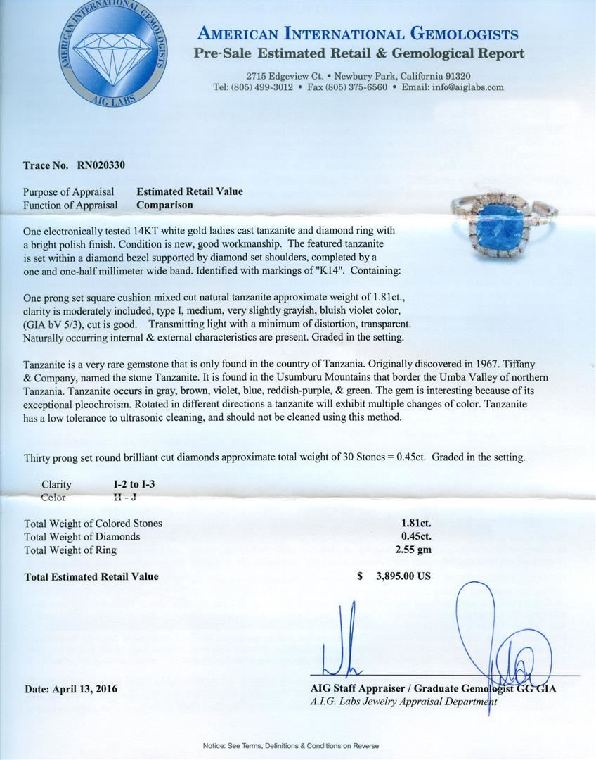 One electronically tested 14KT white gold ladies cast tanzanite and diamond ring with a bright polish finish. The featured tanzanite is set within a diamond bezel supported by diamond set shoulders, completed by a one and one-half millimeter wide band. Identified with markings of "K14". Condition is new, good workmanship. Containing: One prong set square cushion mixed cut natural tanzanite approximate weight of 1.81ct., clarity is moderately included, type I, medium, very slightly grayish, bluish violet color, (GIA bV 5/3), cut is good. Transmitting light with a minimum of distortion, transparent. Naturally occurring internal & external characteristics are present. Graded in the setting. Tanzanite is a very rare gemstone that is only found in the country of Tanzania. Originally discovered in 1967. Tiffany & Company, named the stone Tanzanite. It is found in the Usumburu Mountains that border the Umba Valley of northern Tanzania. Tanzanite occurs in gray, brown, violet, blue, reddish-purple, & green. The gem is interesting because of its exceptional pleochroism. Rotated in different directions a tanzanite will exhibit multiple changes of color. Tanzanite has a low tolerance to ultrasonic cleaning, and should not be cleaned using this method. Thirty prong set round brilliant cut diamonds approximate total weight of 30 Stones = 0.45ct. Graded in the setting. Clarity: I-2 to I-3. Color: H - J. Total Weight of Colored Stones 1.81ct. Total Weight of Diamonds 0.45ct. Total Weight of Ring 2.55gm. AIG Appraised at $3,895.00.