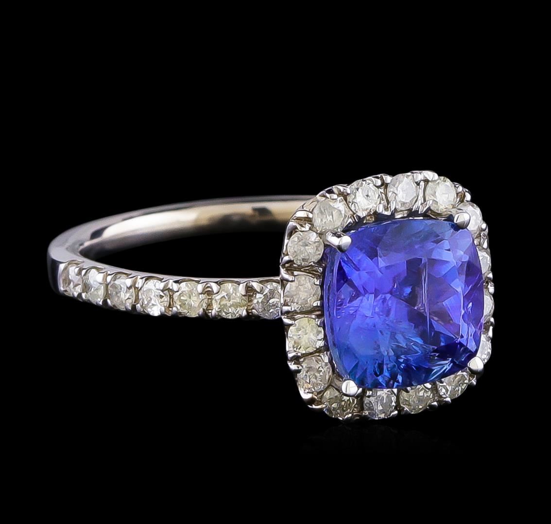 One electronically tested 14KT white gold ladies cast tanzanite and diamond ring with a bright polish finish. The featured tanzanite is set within a diamond bezel supported by diamond set shoulders, completed by a one and one-half millimeter wide band. Identified with markings of "K14". Condition is new, good workmanship. Containing: One prong set square cushion mixed cut natural tanzanite approximate weight of 1.81ct., clarity is moderately included, type I, medium, very slightly grayish, bluish violet color, (GIA bV 5/3), cut is good. Transmitting light with a minimum of distortion, transparent. Naturally occurring internal & external characteristics are present. Graded in the setting. Tanzanite is a very rare gemstone that is only found in the country of Tanzania. Originally discovered in 1967. Tiffany & Company, named the stone Tanzanite. It is found in the Usumburu Mountains that border the Umba Valley of northern Tanzania. Tanzanite occurs in gray, brown, violet, blue, reddish-purple, & green. The gem is interesting because of its exceptional pleochroism. Rotated in different directions a tanzanite will exhibit multiple changes of color. Tanzanite has a low tolerance to ultrasonic cleaning, and should not be cleaned using this method. Thirty prong set round brilliant cut diamonds approximate total weight of 30 Stones = 0.45ct. Graded in the setting. Clarity: I-2 to I-3. Color: H - J. Total Weight of Colored Stones 1.81ct. Total Weight of Diamonds 0.45ct. Total Weight of Ring 2.55gm. AIG Appraised at $3,895.00.