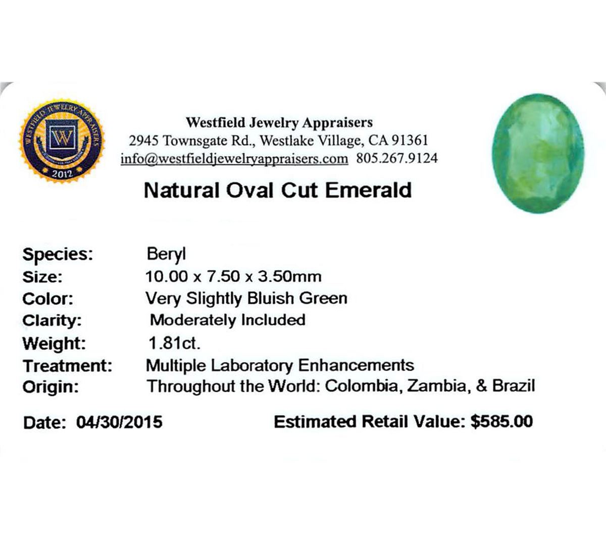 One oval mixed cut natural emerald exact weight 1.81ct., clarity is moderately included, type III, medium dark, very slightly grayish, very slightly bluish green color, (GIA vslbG 6/3), cut is good. Westfield Appraised at $585.00.