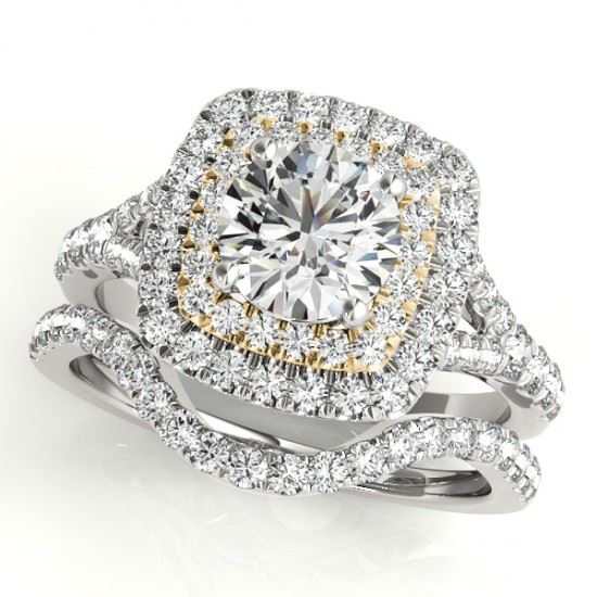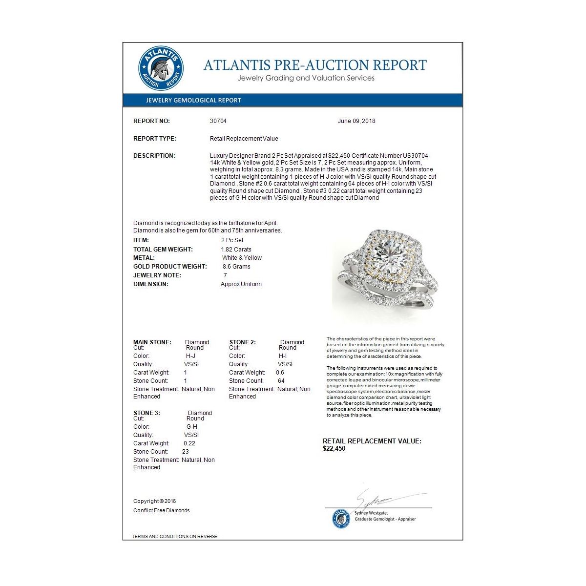 REF-408W5F -30704 ---- 1.82 CTW Certified VS/SI Diamond 2Pc Set Solitaire Halo 14K White & Yellow Gold ---- Luxury Designer Brand 2 Pc Set Appraised at $22,450 Certificate Number US30704 14k White & Yellow gold, 2 Pc Set Size is 7, 2 Pc Set measuring approx. Uniform, weighing in total approx. 8.3 grams. Made in the USA and is stamped 14k, Main stone 1 carat total weight containing 1 pieces of H-J color with VS/SI quality Round shape cut Diamond , Stone #2 0.6 carat total weight containing 64 pieces of H-I color with VS/SI quality Round shape cut Diamond , Stone #3 0.22 carat total weight containing 23 pieces of G-H color with VS/SI quality Round shape cut Diamond