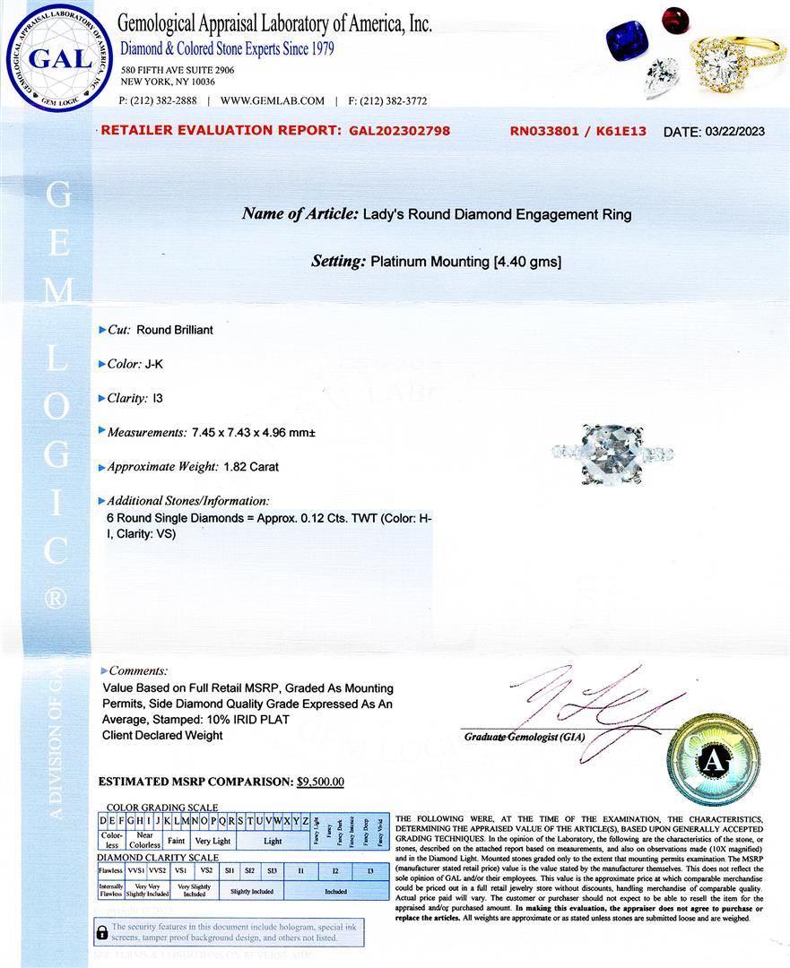 Name of Article: Lady's Round Diamond Engagement Ring Setting: Platinum Mounting [4.40 gms] Cut: Round Brilliant Color: J-K Clarity: I3 Measurements: 7.45 x 7.43 x 4.96mm Aproximate Weight: 1.82 Carat #Additional Stones/Information:# 6 Round Single Diamon