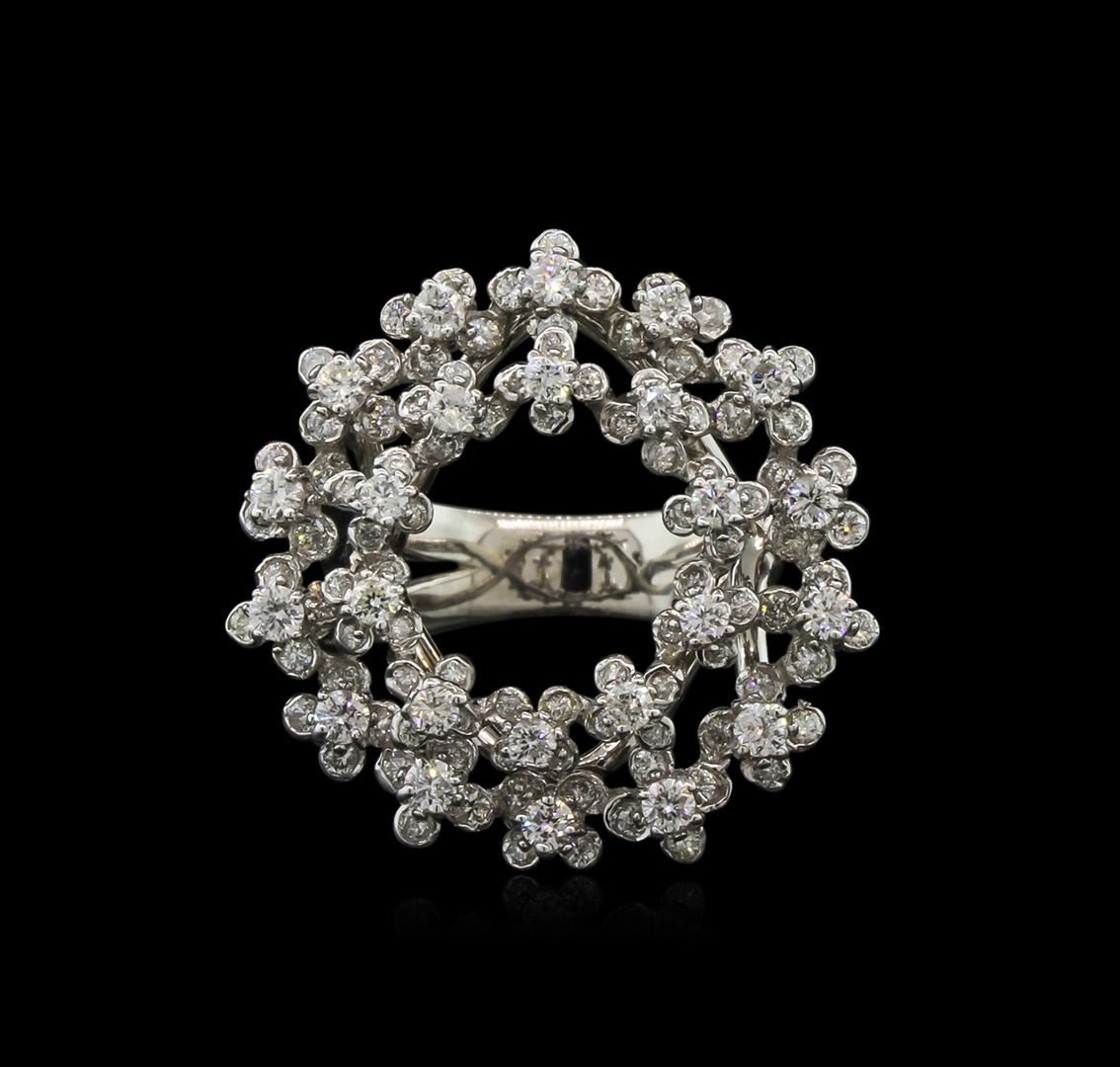 One electronically tested 14KT white gold lady's cast fashion ring with a basket setting with a bright polish finish. The featured ring has a 4.1mm shank Identified with markings of "585". Condition is new, good workmanship. Containing: Fourteen prong set round brilliant cut diamonds, measuring 2.00 - 1.95 x 1.29mm (depth est.) approximate. Total Weight of 14 Stones = 0.42ct. Clarity: SI-1 to I-1. Color: H - Good Ten prong set round brilliant cut diamonds, measuring 1.80 - 1.75 x 1.16mm (depth est.) approximate. Total Weight of 10 Stones = 0.23ct. Graded in the setting. Clarity: SI-1 to I-1. Color: H - I. Cut Good Ninety-Six bezel set round brilliant cut diamonds, measuring 1.45 - 1.40 x 0.93mm (depth est.) approximate. Total Weight of 96 Stones = 1.17ct. Graded in the setting. Clarity: SI-1 to I-1. Color: H - I. Cut Good. Total Weight of Diamonds 1.82ct. Total Weight of Ring 9.00gm. GAS Appraised at $6,005.00.