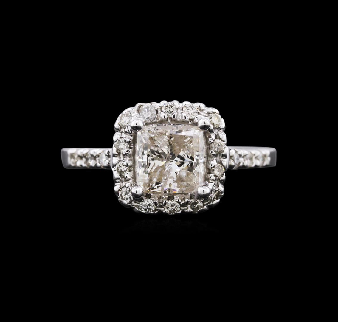 One electronically tested 14KT white gold ladies cast diamond engagement ring with a bright polish finish. Identified with markings of "14K". Condition is new. Containing: One prong set princess cut diamond, measuring 6.00 x 6.00 x 4.50mm (depth est.) approximate weight of 1.52ct. Clarity: I-2. Color: L, Cut is Good. Twenty prong set round brilliant cut diamonds, measuring 1.50 - 1.50 x 0.90mm (depth est.) approximate total weight of 20 Stones = 0.30ct. Clarity: SI-2 to I-1. Color: I - J, Cut is Good. Diamonds are graded in the mounting, unless otherwise stated. Total Weight of Diamonds 1.82ct. Total Weight of Engagement Ring 4.50 grams. GGL Appraised at $5,580.00.