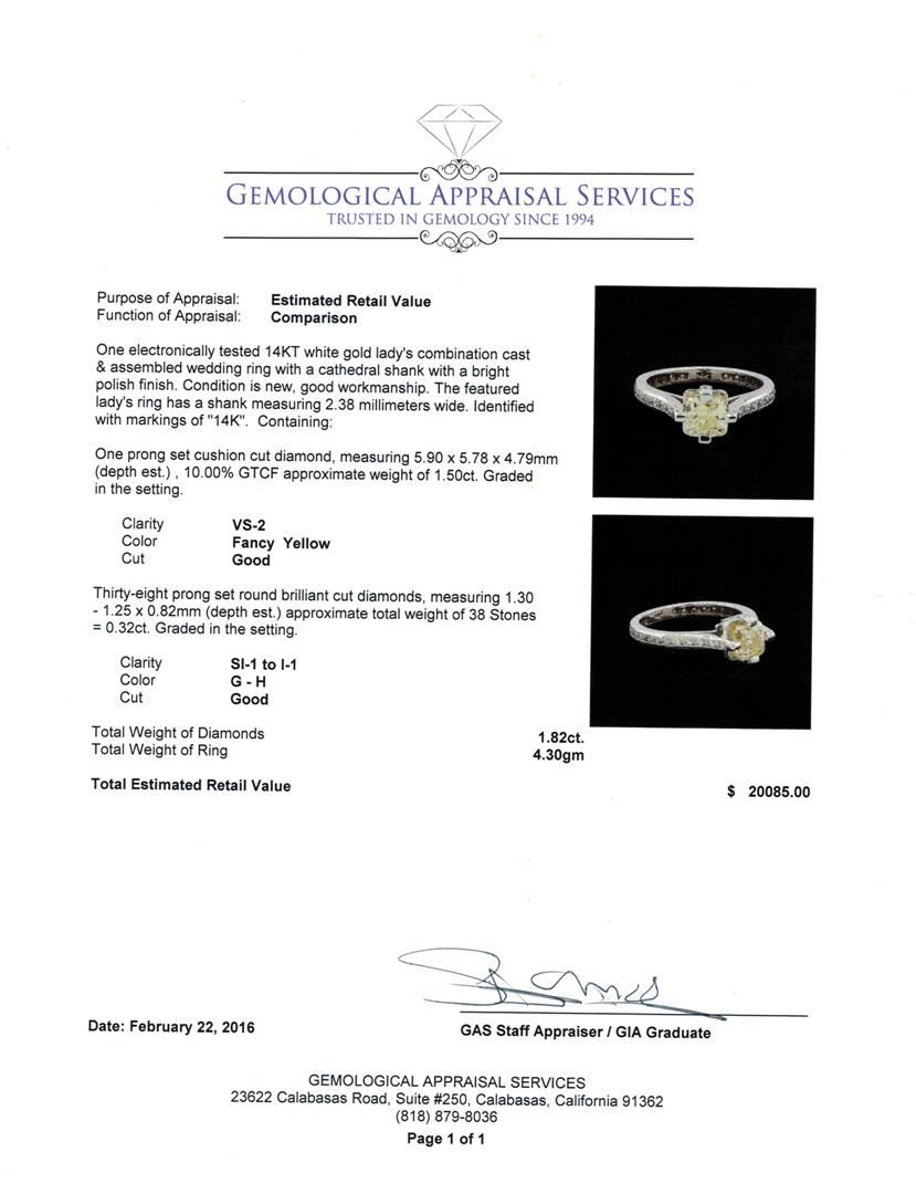 One electronically tested 14KT white gold lady's combination cast & assembled wedding ring with a cathedral shank with a bright polish finish. The featured lady's ring has a shank measuring 2.38 millimeters wide. Identified with markings of "14K". Condition is new, good workmanship. Containing: One prong set cushion cut diamond, measuring 5.90 x 5.78 x 4.79mm (depth est.) , 10.00.%. GTCF approximate weight of 1.50ct. Graded in the setting. Clarity: VS-2 Cut Good Thirty-Eight prong set round brilliant cut diamonds, measuring 1.30 - 1.25 x 0.82mm (depth est.) approximate total weight of 38 Stones = 0.32ct. Graded in the setting. Clarity: SI-1 to I-1. Color: G - H. Cut Good. Total Weight of Diamonds 1.82ct. Total Weight of Ring 4.30gm. GAS Appraised at $20,085.00.