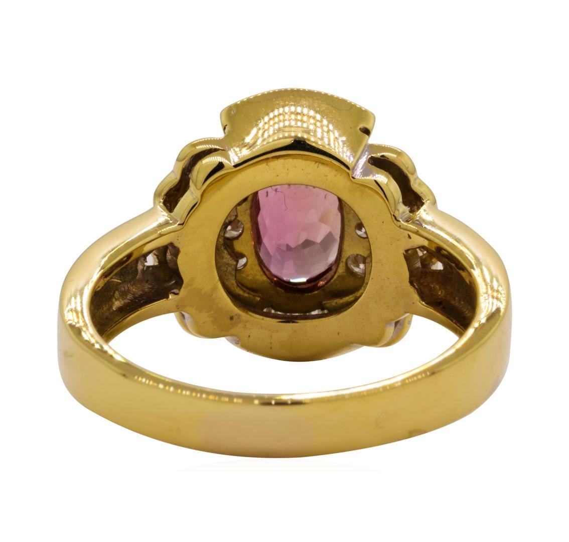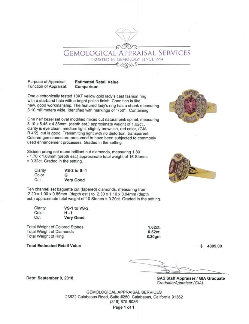 One electronically tested 18KT yellow gold lady's cast fashion ring with a starburst halo with a bright polish finish. The featured lady's ring has a shank measuring 3.10 millimeters wide. Identified with markings of '750'. Condition is like new, good workmanship. Containing: One half bezel set oval modified mixed cut natural pink spinel, measuring 8.10 x 5.45 x 4.86mm, (depth est.) approximate weight of 1.62ct., clarity is eye clean, medium light, slightly brownish, red color, (GIA R 4/2), cut is good. Transmitting light with no distortion, transparent. Colored gemstones are presumed to have been subjected to commonly used enhancement processes. Graded in the setting. Sixteen prong set round brilliant cut diamonds, measuring 1.80 - 1.70 x 1.08mm (depth est.) approximate total weight of 16 Stones = 0.32ct. Graded in the setting. Color G Clarity VS-2 to SI-1 Cut Very Good Ten channel set baguette cut (tapered) diamonds, measuring from 2.20 x 1.00 x 0.85mm (depth est.) to 2.30 x 1.10 x 0.94mm (depth est.) approximate total weight of 10 Stones = 0.20ct. Graded in the setting. Color H - I Clarity VS-1 to VS-2 Cut Very Good. Total Weight of Colored Stones 1.62ct.. Total Weight of Diamonds 0.52ct.. Total Weight of Ring 8.20gm GAS Appraised at $4895.00. GAS Appraised at $4,895.00.