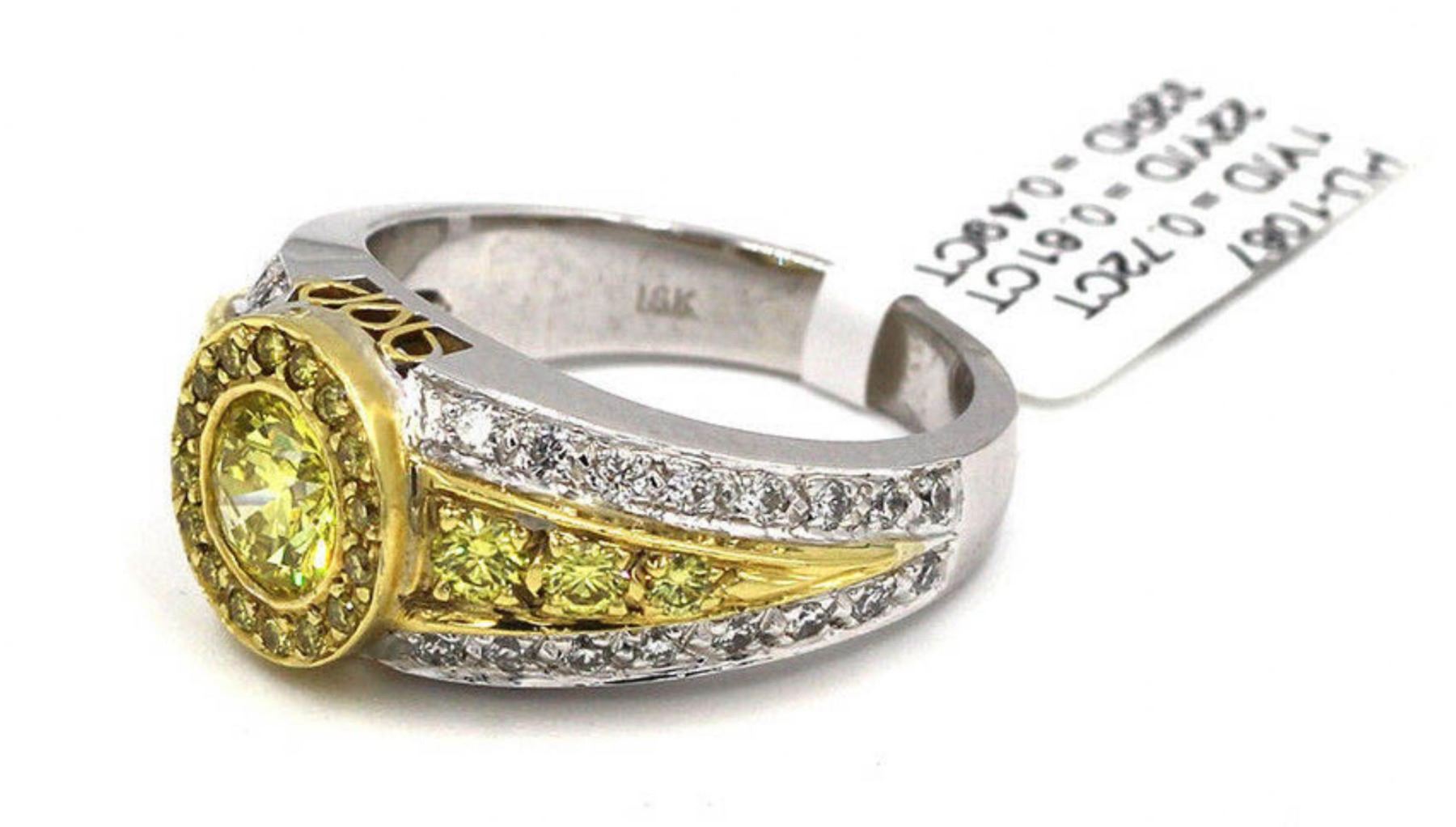 One lady's wedding ring featuring: 18KT yellow and white gold weighing 10.61 grams containing one center yellow diamond weighing 0.72ct and 54 diamonds weighing 1.10ctw. The center diamond is round cut, SI1-SI2 clarity, fancy yellow color and very good cut. The side diamonds are round brilliant cut, SI1-SI2 clarity, G-H color and very good cut. The ring is a size 6.75 but can be resized.