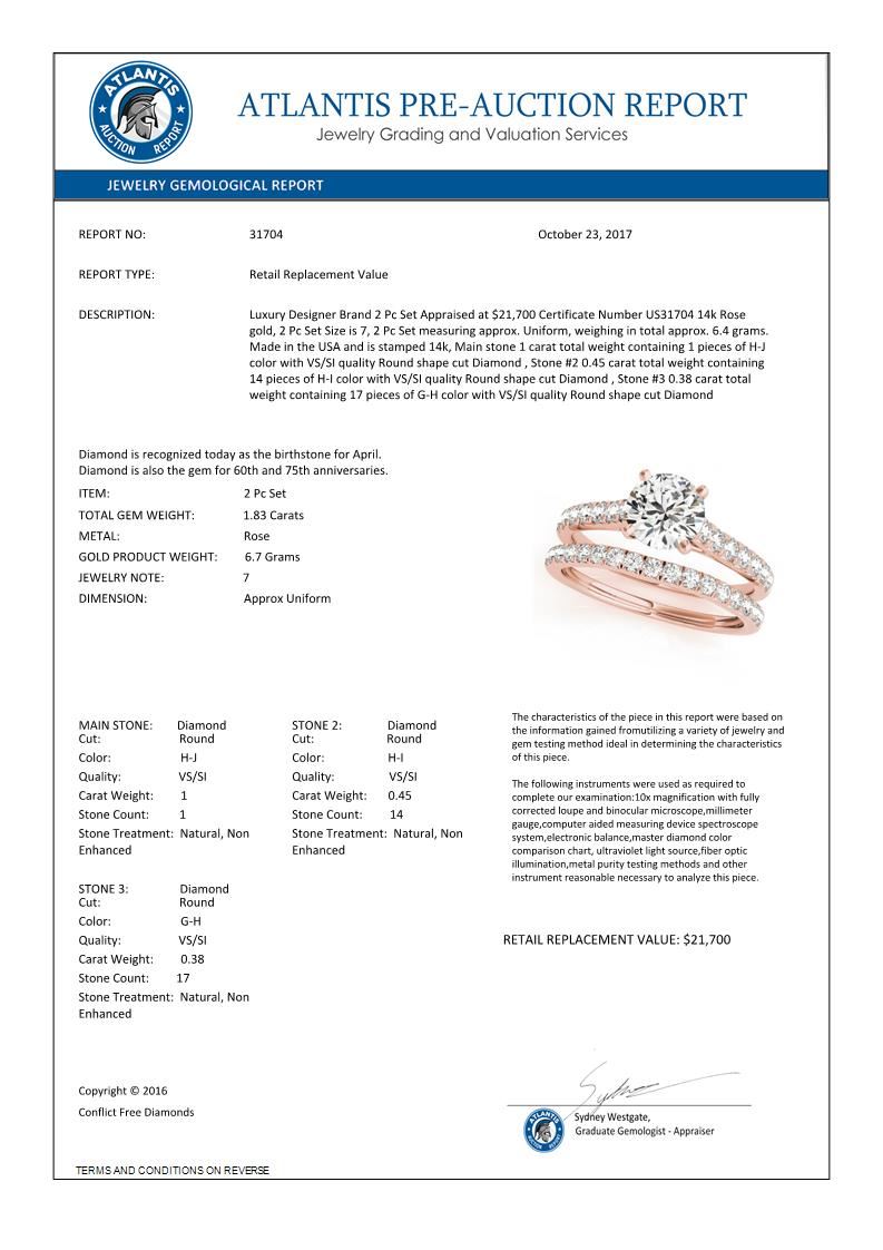 REF-394F8N -31704 ---- 1.83 CTW Certified VS/SI Diamond Solitaire 2Pc Wedding Set 14K Rose Gold ---- Luxury Designer Brand 2 Pc Set Appraised at $21,700 Certificate Number US31704 14k Rose gold, 2 Pc Set Size is 7, 2 Pc Set measuring approx. Uniform, weighing in total approx. 6.4 grams. Made in the USA and is stamped 14k, Main stone 1 carat total weight containing 1 pieces of H-J color with VS/SI quality Round shape cut Diamond , Stone #2 0.45 carat total weight containing 14 pieces of H-I color with VS/SI quality Round shape cut Diamond , Stone #3 0.38 carat total weight containing 17 pieces of G-H color with VS/SI quality Round shape cut Diamond