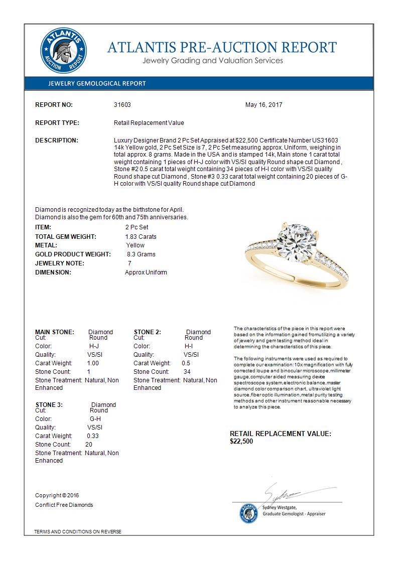 1.83 CTW Certified VS/SI Diamond Solitaire 2Pc Wedding Set 14K Yellow Gold ---- Luxury Designer Brand 2 Pc Set Appraised Retail Price at $22,500 ---- SKU Number US31603 14k Yellow gold 2 Pc Set Size is 7, 2 Pc Set measuring approx. Uniform, weighing in total approx. 8 grams. Made in the USA and is stamped 14k, Main stone 1.00 carat total weight containing 1 pieces of H-J color with VS/SI quality Round shape cut Diamond , Stone #2 0.5 carat total weight containing 34 pieces of H-I color with VS/SI quality Round shape cut