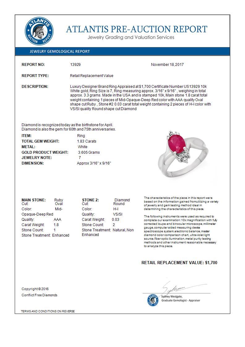 REF-25F6N -13929 ---- 1.83 CTW Ruby & Diamond Ring 10K White Gold ---- Luxury Designer Brand Ring Appraised at $1,700 Certificate Number US13929 10k White gold, Ring Size is 7, Ring measuring approx. 3/16" x 9/16" , weighing in total approx. 3.3 grams. Made in the USA and is stamped 10k, Main stone 1.8 carat total weight containing 1 pieces of Mid-Opaque-Deep Red color with AAA quality Oval shape cut Ruby , Stone #2 0.03 carat total weight containing 2 pieces of H-I color with VS/SI quality Round shape cut Diamond