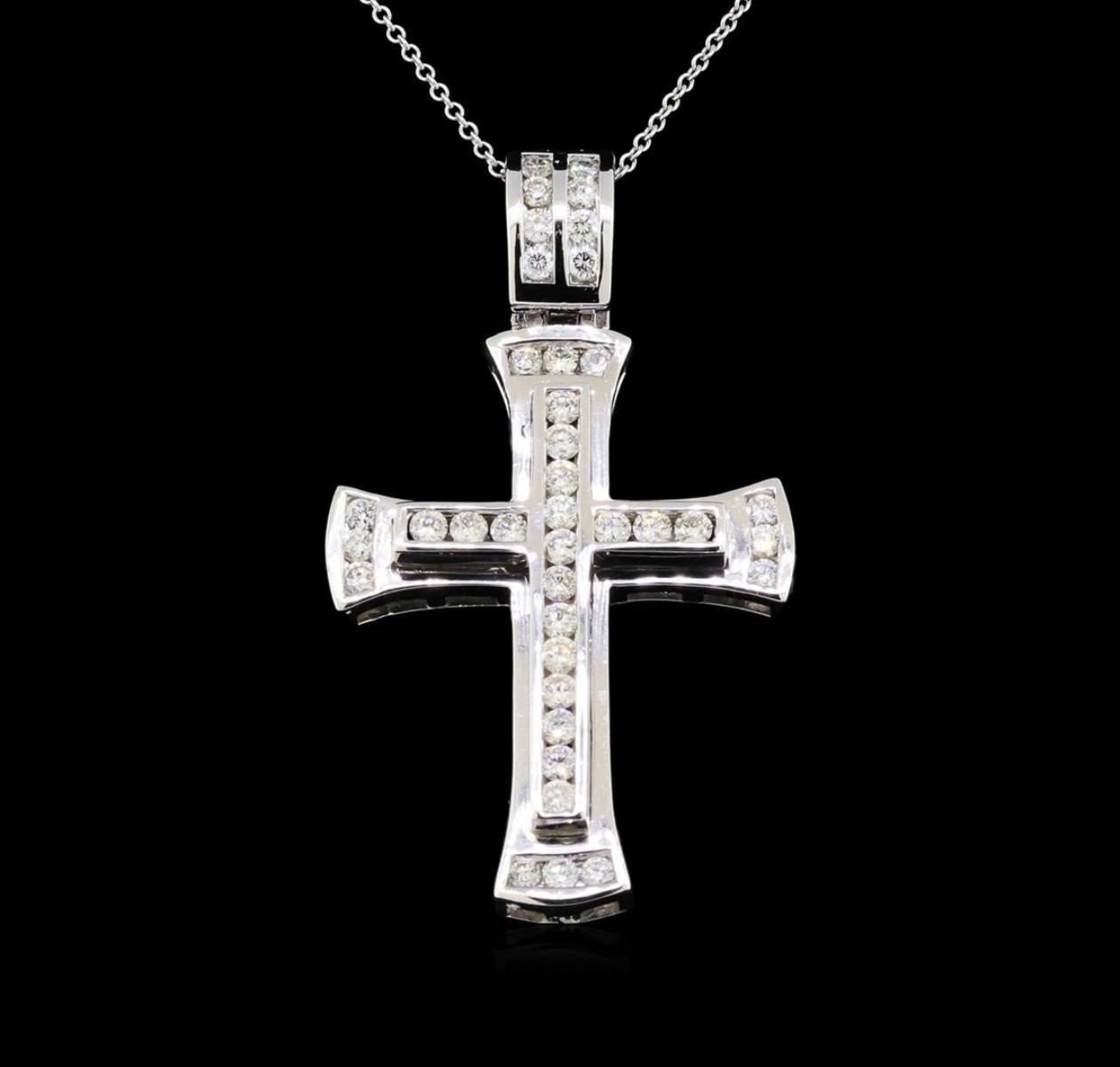 One electronically tested 14KT white gold cast & assembled diamond cross pendant with chain. The two inch length pendant features a diamond set tiered cross supported by an elaborate lattice under gallery, completed by a diamond set bail. The pendant is supported by a sixteen inch length 14KT white gold cable chain, terminating in a lobster claw clasp. Condition is new, good workmanship. Containing: Eighteen channel set round brilliant cut diamonds, measuring 2.50 - 2.50 x 1.50mm (depth est.) approximate total weight of 18 Stones = 1.05ct. Graded in the setting. Clarity: SI-2 to I-1. Color: G - I Twenty channel set round brilliant cut diamonds, measuring 2.20 - 2.20 x 1.32mm (depth est.) approximate total weight of 20 Stones = 0.78ct. Graded in the setting. Clarity: SI-2 to I-1. Color: G - I. Total Weight of Diamonds 1.83ct. Total Weight of Pendant With Chain 17.27gm. AIG Appraised.