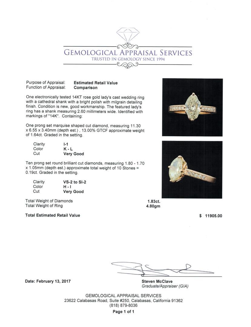 One electronically tested 14KT rose gold lady's cast wedding ring with a cathedral shank with a bright polish with milgrain detailing finish. The featured lady's ring has a shank measuring 2.60 millimeters wide. Identified with markings of '14K'. Condition is new, good workmanship. Containing: One prong set marquise shaped cut diamond, measuring 11.30 x 6.55 x 3.40mm (depth est.) , 13.00.%. GTCF approximate weight of 1.64ct. Graded in the setting. Clarity I-1. Color: K - L Cut Very Good Ten prong set round brilliant cut diamonds, measuring 1.80 - 1.70 x 1.05mm (depth est.) approximate total weight of 10 Stones = 0.19ct. Graded in the setting. Clarity VS-2 to SI-2. Color: H - I Cut Very Good. Total Weight of Diamonds 1.83ct.. Total Weight of Ring 4.80gm. GAS Appraised.