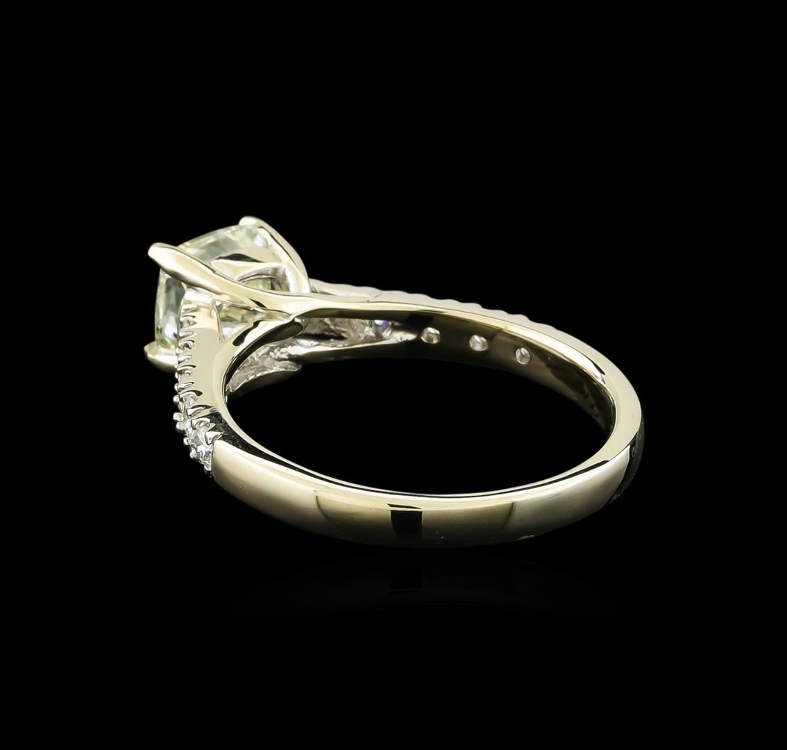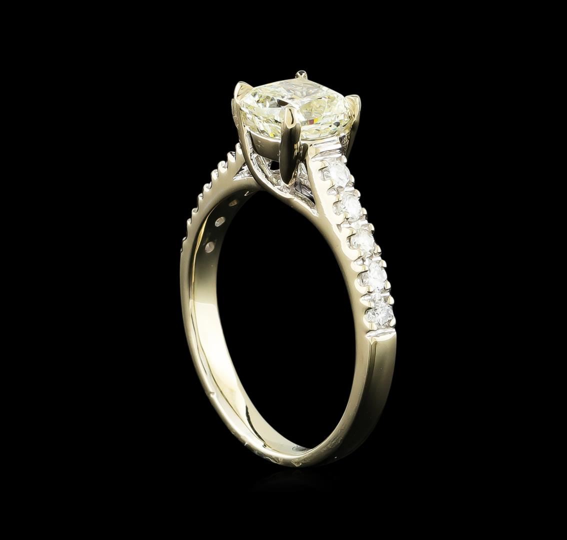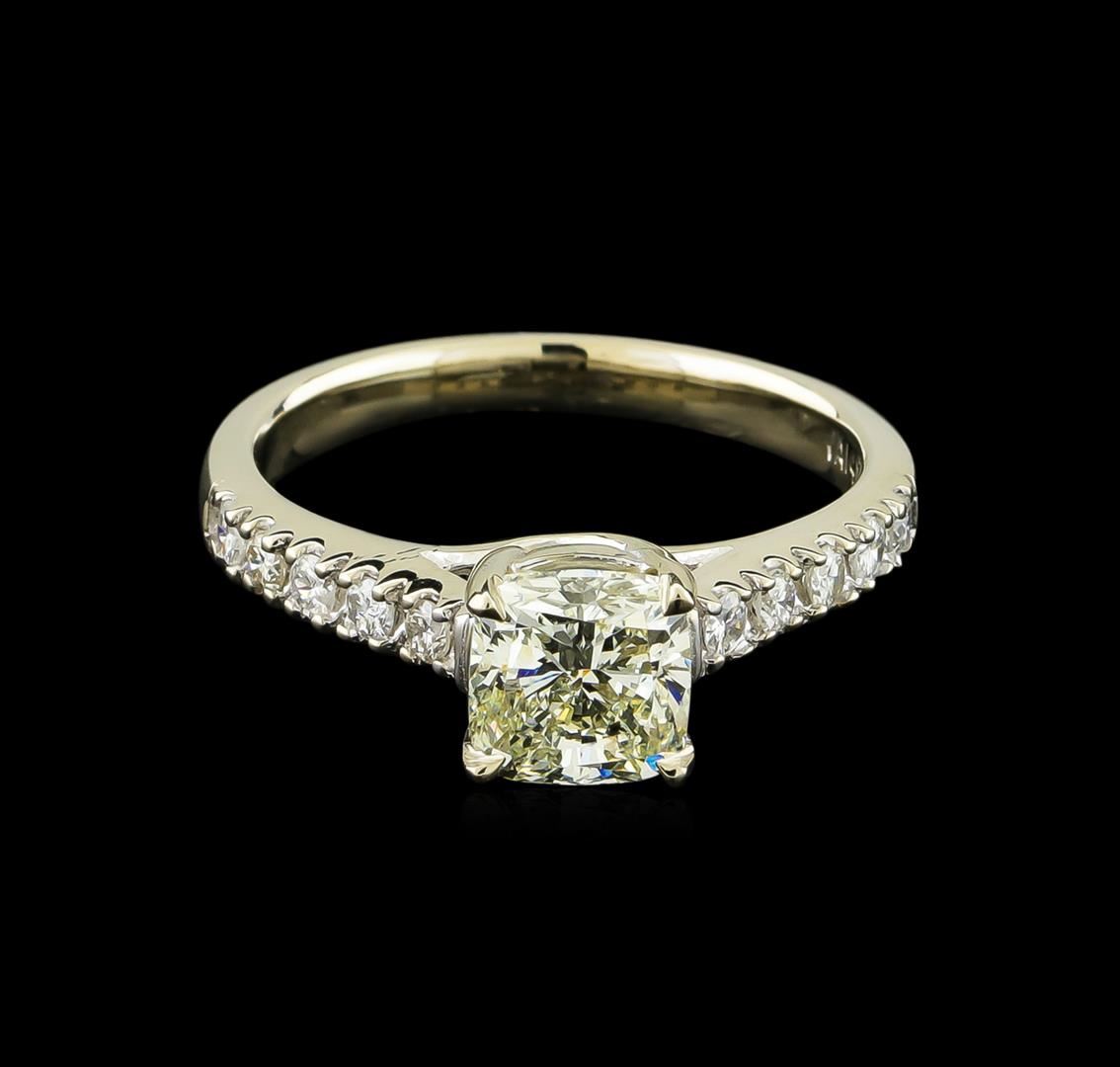 One electronically tested 14KT white gold ladies cast diamond unity ring with a bright polish finish. The featured diamond is supported by diamond ribbon shoulders, completed by a two millimeter wide band. Identified with markings of "14K". Condition is new, good workmanship. Containing: One prong set cushion cut diamond, measuring 6.20 x 6.20 x 4.50mm (depth est.), 5.00.%. GTCF approximate weight of 1.53ct. Graded in the setting. Clarity: SI-2. Depth: 72.6%. Table 71.0%. Ten prong set round brilliant cut diamonds, measuring 2.00 - 1.90 x 1.17mm (depth est.) approximate total weight of 10 Stones = 0.30ct. Graded in the setting. Clarity: SI-2 to I-2. Color: G - I. Total Weight of Diamonds 1.83ct. Total Weight of Ring 3.76gm. AIG Appraised at $9,085.00.