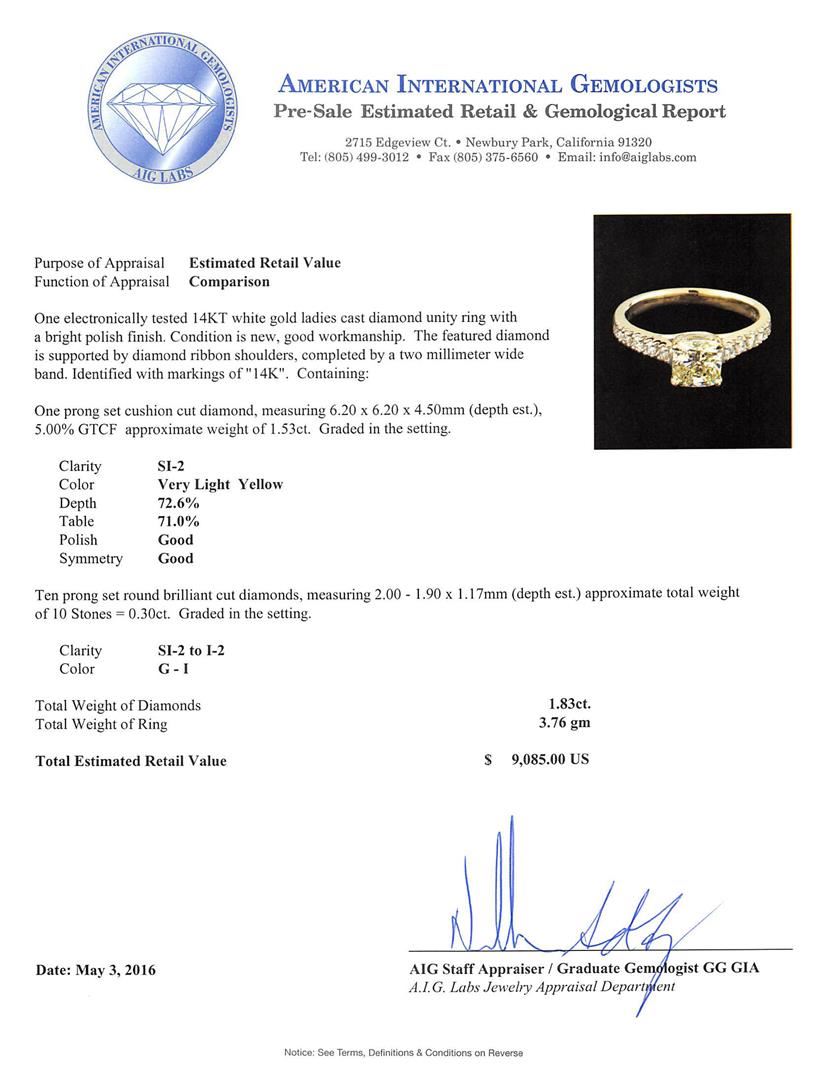 One electronically tested 14KT white gold ladies cast diamond unity ring with a bright polish finish. The featured diamond is supported by diamond ribbon shoulders, completed by a two millimeter wide band. Identified with markings of "14K". Condition is new, good workmanship. Containing: One prong set cushion cut diamond, measuring 6.20 x 6.20 x 4.50mm (depth est.), 5.00.%. GTCF approximate weight of 1.53ct. Graded in the setting. Clarity: SI-2. Depth: 72.6%. Table 71.0%. Ten prong set round brilliant cut diamonds, measuring 2.00 - 1.90 x 1.17mm (depth est.) approximate total weight of 10 Stones = 0.30ct. Graded in the setting. Clarity: SI-2 to I-2. Color: G - I. Total Weight of Diamonds 1.83ct. Total Weight of Ring 3.76gm. AIG Appraised at $9,085.00.