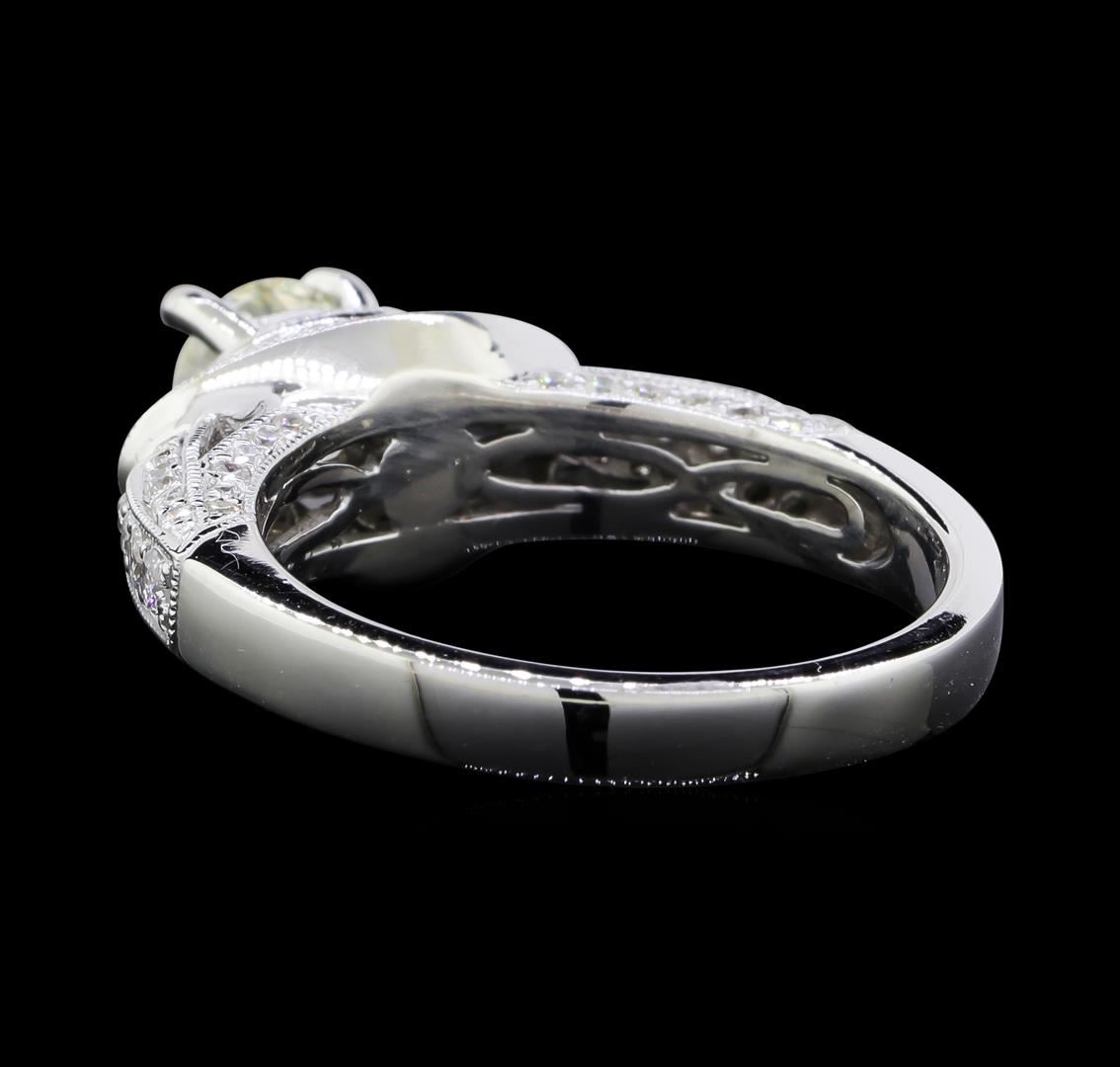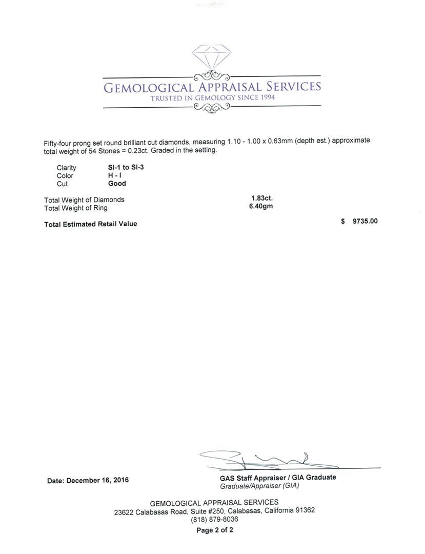 One electronically tested 18KT white gold lady's cast wedding ring with a cathedral shank with a bright polish with milgrain detailing finish. The featured lady's ring has a shank measuring 2.86 millimeters wide. Identified with markings of '18K 750'. Condition is new, good workmanship. Containing: One prong set round brilliant cut diamond, measuring 5.76 - 5.72 x 3.62mm (depth est.) , 5.00.%. GTCF approximate weight of 0.78ct. Graded in the setting. Clarity VS-1. Color: J Cut Very Good Twenty-Five prong set baguette cut diamonds, measuring from 2.00 x 1.00 x 0.85mm (depth est.) to 2.90 x 1.50 x 1.15mm (depth est.) approximate total weight of 25 Stones = 0.70ct. Graded in the setting. Clarity VS-2 to SI-1. Color: G - H Cut Good Four prong set round brilliant cut diamonds, measuring 1.80 - 1.70 x 1.09mm (depth est.) approximate total weight of 4 Stones = 0.08ct. Graded in the setting. Clarity SI-1 to SI-2. Color: H Cut Good Four prong set round brilliant cut diamonds, measuring 1.40 - 1.30 x 0.84mm (depth est.) approximate total weight of 4 Stones = 0.04ct. Graded in the setting. Clarity SI-1 to SI-2. Color: H - I Cut Good Fifty-Four prong set round brilliant cut diamonds, measuring 1.10 - 1.00 x 0.63mm (depth est.) approximate total weight of 54 Stones = 0.23ct. Graded in the setting. Clarity SI-1 to SI-3. Color: H - I Cut Good. Total Weight of Diamonds 1.83ct.. Total Weight of Ring 6.40gm. GAS Appraised at $9,735.00.