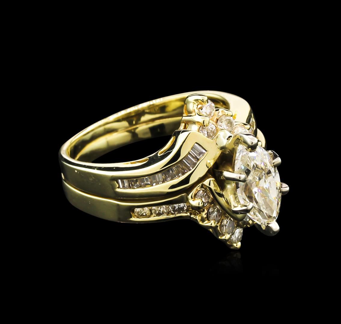 One electronically tested 14KT yellow gold lady's combination cast & assembled wedding ring soldered to wedding band with a bypass shank with a bright polish finish. The featured lady's ring has a double shank measuring 3.70 millimeters wide. Condition is new, good workmanship. Containing: One prong set marquise shaped cut diamond, measuring 9.50 x 4.64 x 3.70mm (depth est.) approximate weight of 1.00ct. Graded in the setting. Clarity: SI-1. Color: L - Very Good Ten prong set round brilliant cut diamonds, measuring 2.30 - 2.20 x 1.46mm (depth est.) approximate total weight of 10 Stones = 0.45ct. Graded in the setting. Clarity: SI-1 to I-1. Color: H - Good Sixteen prong set baguette cut diamonds, measuring from 1.05 x 1.10 x 0.94mm (depth est.) to 1.60 x 1.30 x 1.11mm (depth est.) approximate total weight of 16 Stones = 0.25ct. Graded in the setting. Clarity: VS-2 to SI-2. Color: H - I. Cut Good Six channel set round brilliant cut diamonds, measuring 1.90 - 1.60 x 1.14mm (depth est.) approximate total weight of 6 Stones = 0.13ct. Graded in the setting. Clarity: SI-2 to I-1. Color: I - L. Cut Good. Total Weight of Diamonds 1.83ct. Total Weight of Ring Soldered To Wedding Band 7.60gm. GAS Appraised at $6,965.00.