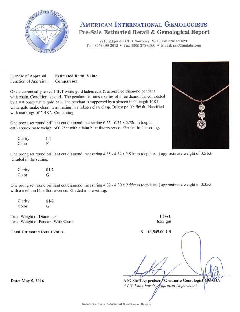 One electronically tested 14KT white gold ladies cast & assembled diamond pendant with chain. The pendant features a series of three diamonds, completed by a stationary white gold bail. The pendant is supported by a sixteen inch length 14KT white gold snake chain, terminating in a lobster claw clasp. Bright polish finish. Identified with markings of "14K". Condition is good. Containing: One prong set round brilliant cut diamond, measuring 6.25 - 6.24 x 3.72mm (depth est.) approximate weight of 0.98ct with a faint blue fluorescence. Graded in the setting. Clarity: I-1. Color: F One prong set round brilliant cut diamond, measuring 4.85 - 4.84 x 2.91mm (depth est.) approximate weight of 0.51ct. Graded in the setting. Clarity: SI-2. Color: G One prong set round brilliant cut diamond, measuring 4.32 - 4.30 x 2.55mm (depth est.) approximate weight of 0.35ct with a medium blue fluorescence. Graded in the setting. Clarity: SI-2. Color: G. Total Weight of Diamonds 1.84ct. Total Weight of Pendant With Chain 6.55gm. AIG Appraised at $16,565.00.