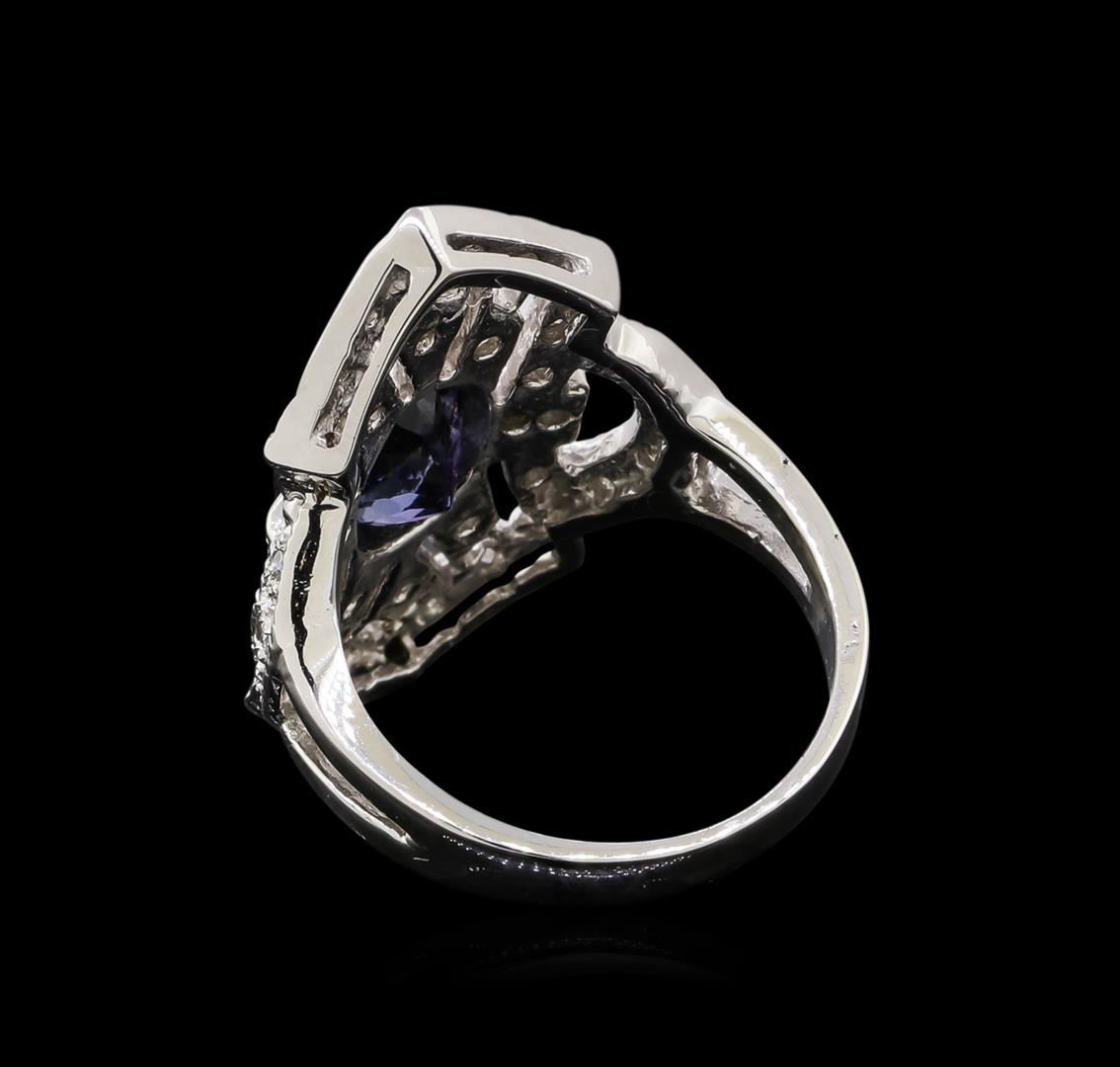 One electronically tested 14KT white gold lady's cast fashion ring with a vintage with a bright polish with milgrain detailing finish. The featured lady's ring has a shank measuring 2.70 millimeters in width. Identified with markings of '14K'. Condition is new, good workmanship. Containing: One bezel set oval modified brilliant cut natural tanzanite, measuring 8.60 x 6.60 x 4.60mm, (depth est.) approximate weight of 1.84ct., clarity is eye clean, medium dark, very slightly grayish, bluish violet color, (GIA bV 6/3), cut is good. Transmitting light with no distortion, transparent. Colored gemstones are presumed to have been subjected to commonly used enhancement processes. Graded in the setting. Thirty-Six prong set round brilliant cut diamonds, measuring 1.70 - 1.60 x 1.02mm (depth est.) approximate total weight of 36 Stones = 0.60ct. Graded in the setting. Clarity SI-1 to SI-2. Color: H - I Cut Good. Total Weight of Colored Stones 1.84ct.. Total Weight of Diamonds 0.60ct.. Total Weight of Ring 6.80gm. GAS Appraised at $4,955.00.