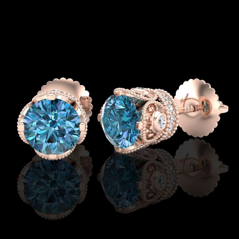 REF-172M8H -37412 ---- 1.85 CTW Fancy Intense Blue Diamond Art Deco Stud Earrings 18K Rose Gold ---- Luxury Designer Brand Earring Appraised at $10,450 Certificate Number US37412 18k Rose gold, Earring Size is Larger, Earring measuring approx. Uniform, weighing in total approx. 5 grams. Made in the USA and is stamped 18k, Main stone 1.15 carat total weight containing 2 pieces of Intense Fancy Blue color with SI quality Round shape cut Diamond , Stone #2 0.7 carat total weight containing 76 pieces of H-I color with VS/SI quality Round shape cut Diamond