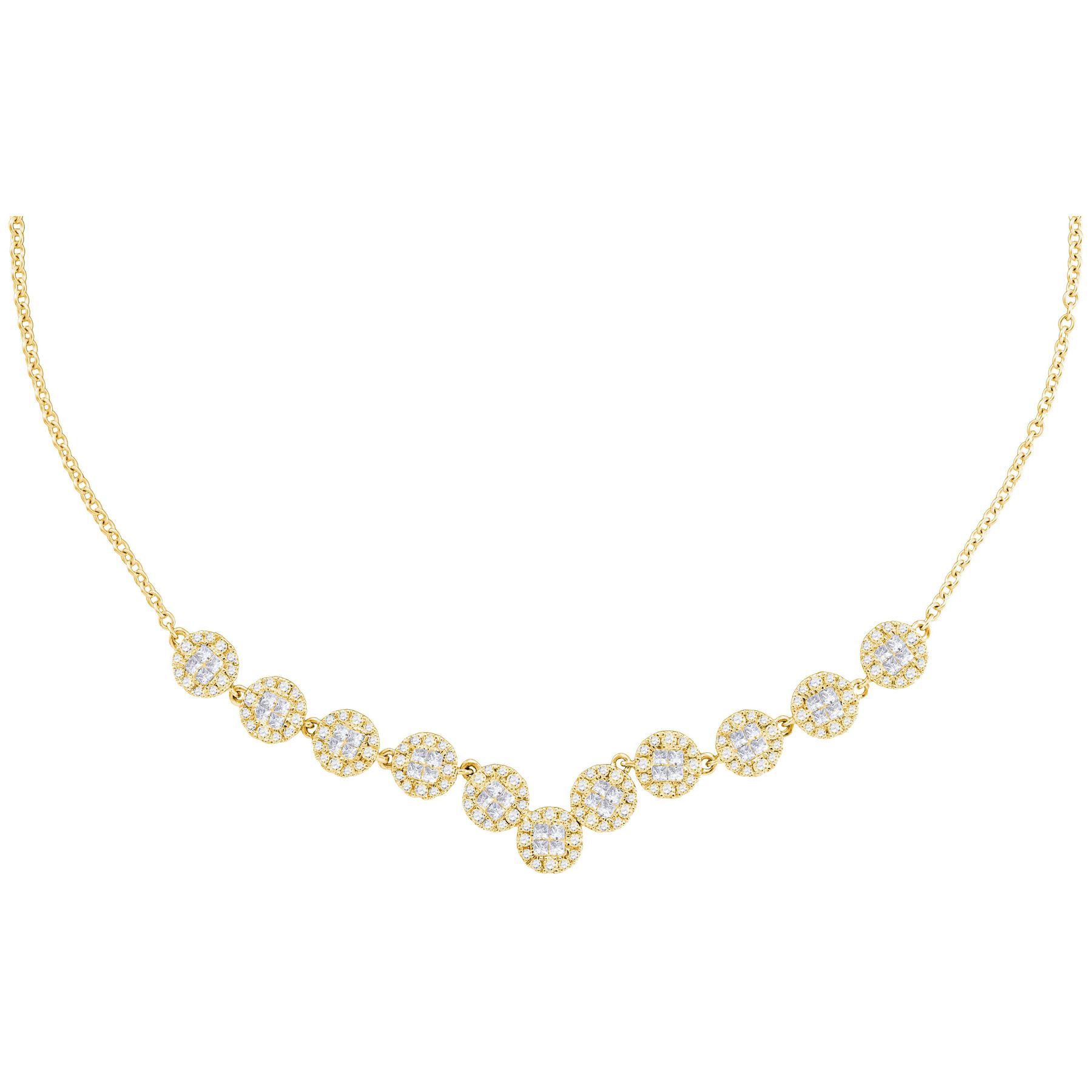 REF-209X9Y- SKU: GD111628 ---- 1.85 CTW Princess Diamond Soleil Cluster Luxury Necklace 14KT Yellow Gold