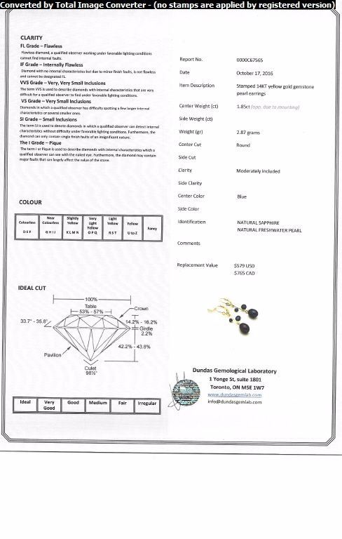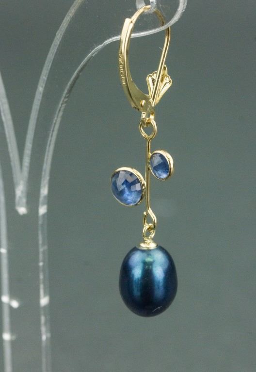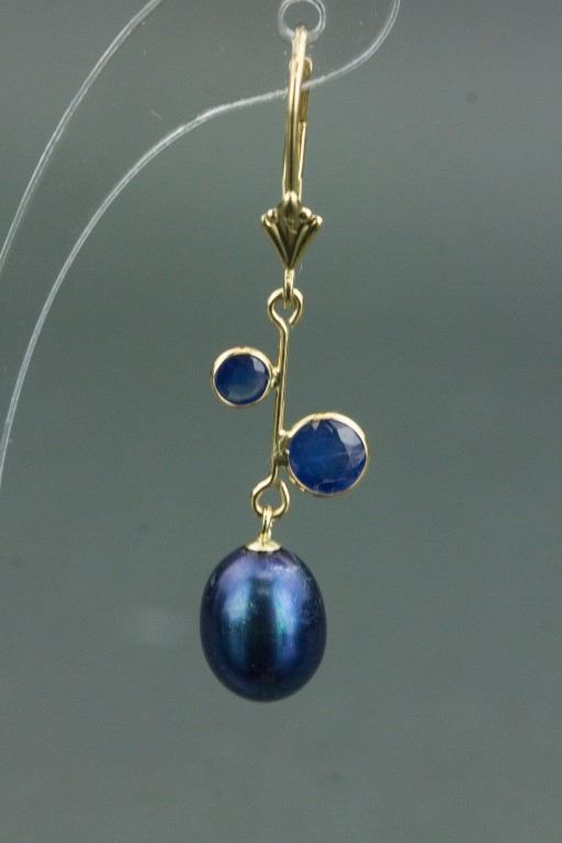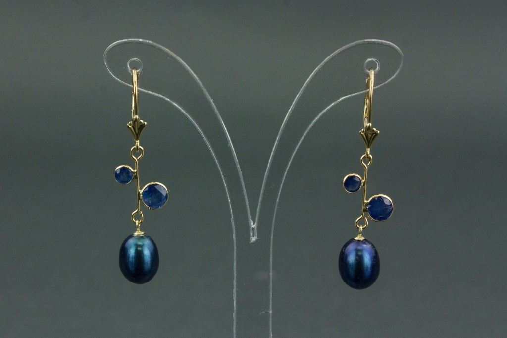 Stamped 14kt yellow gold gemstone pearl earrings; set with 1.85 ct natural sapphire and freshwater pearls; certified replacement value CAD$765; 2.87 grams