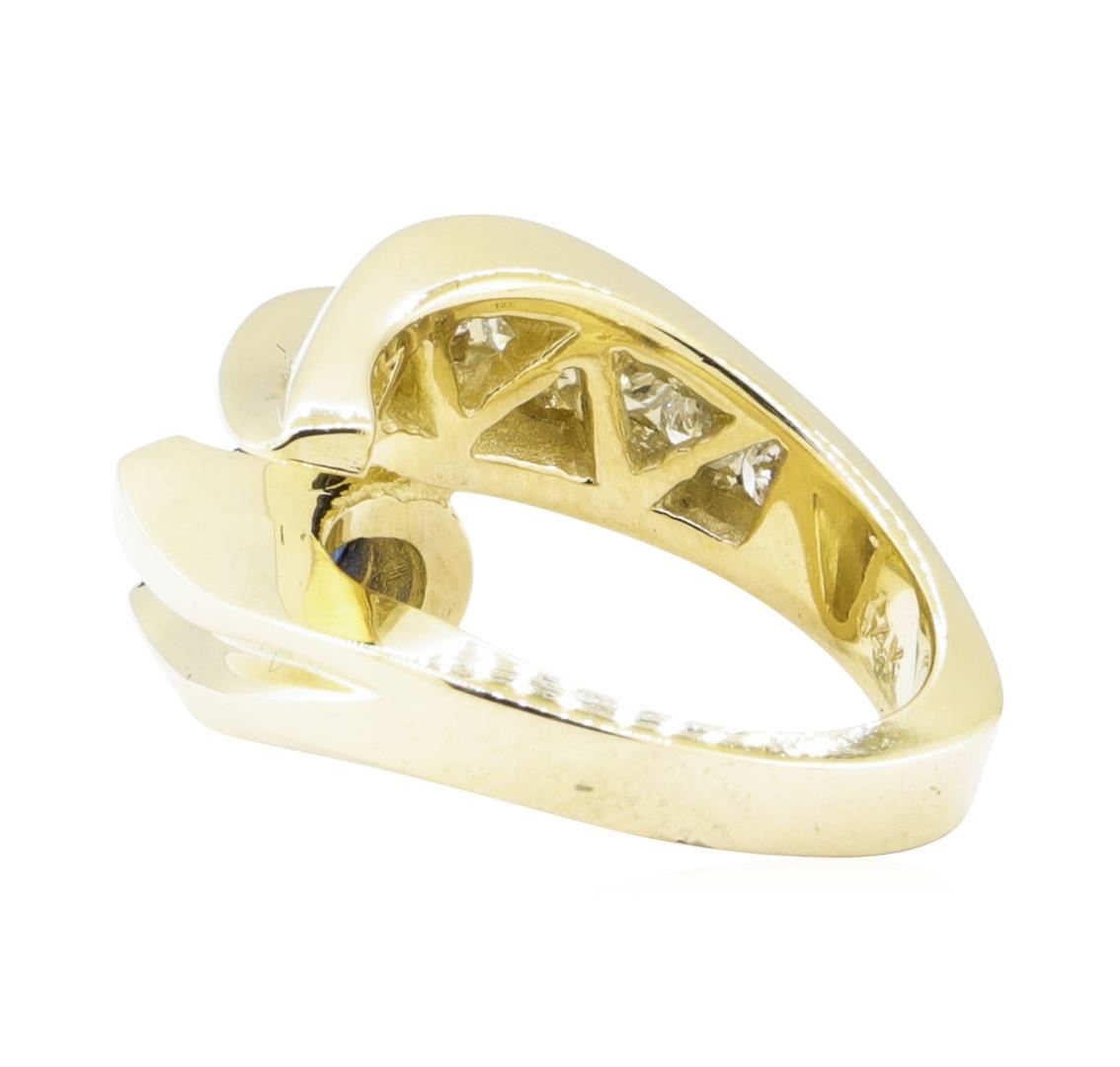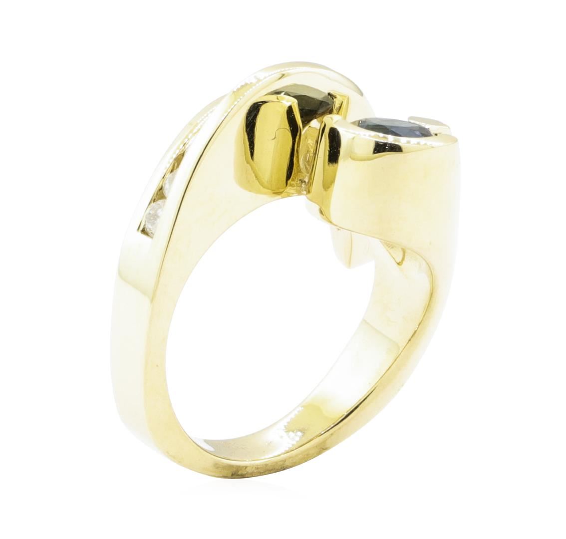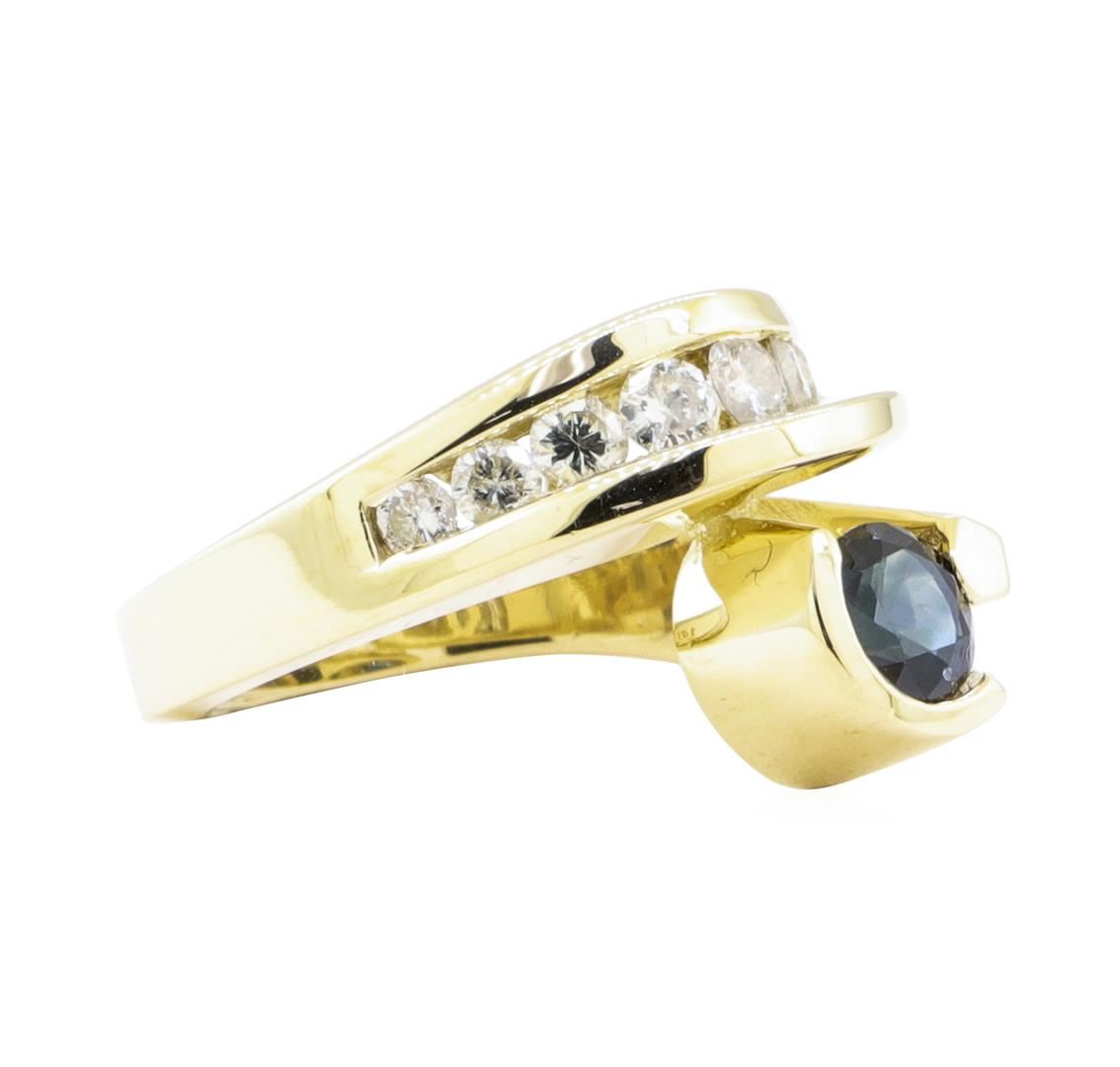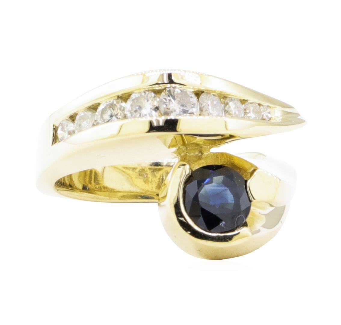 One electronically tested 14KT yellow gold lady's cast fashion ring with a bypass motif with a bright polish finish. The featured lady's ring has geometric accens and a shank measuring 3.70 millimeters wide. Identified with markings of '14K'. Condition is Good. Containing: One prong set round modified mixed cut natural blue sapphire, measuring 6.10 - 6.00 x 3.70 mm, (depth est.) approximate weight of 1.10ct., clarity is slightly included, dark, very slightly grayish, blue color, (GIA B 7/3), cut is good. Transmitting light with a minimum of distortion, transparent. Colored gemstones are presumed to have been subjected to commonly used enhancement processes. Graded in the setting. Nine channel set round brilliant cut diamonds, measuring 3.20 - 2.70 x 1.83mm (depth est.) approximate total weight of 9 Stones = 0.75ct. Graded in the setting. Color I - J Clarity SI-2 to I-1 Cut Good. Total Weight of Colored Stones 1.10ct.. Total Weight of Diamonds 0.75ct.. Total Weight of Ring 13.30gm GAS Appraised at $4450.00. GAS Appraised at $4,450.00.