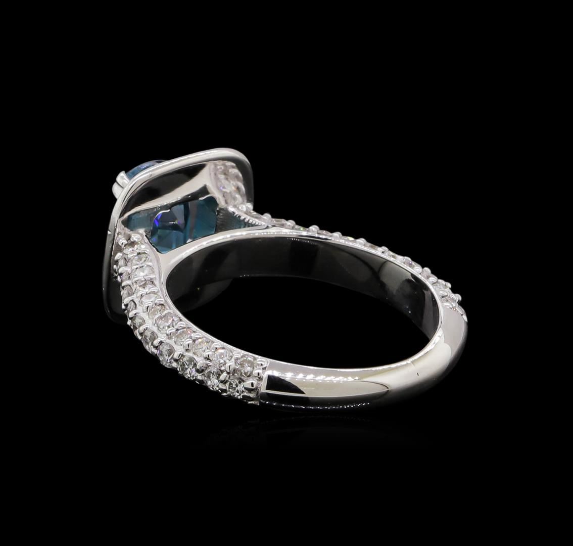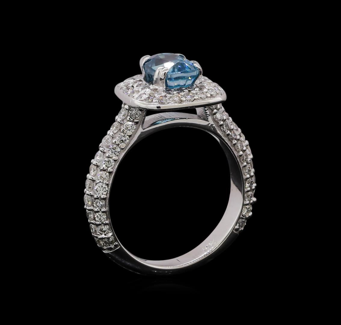 One electronically tested 14KT white gold ladies cast blue zircon and diamond ring. The featured blue zircon is set within a diamond bezel supported by diamond set shoulders, completed by a two millimeter wide band. Bright and patterned finish. Identified with markings of '14K'. Condition is new, good workmanship. Containing: One prong set rectangular cushion mixed cut natural blue zircon, measuring 7.10 x 5.10 x 4.40mm, 5%. bulge factor, approximate weight of 1.85ct., clarity is eye clean, type I, medium, moderately strong, very strongly greenish blue color, (GIA vstgB 5/4), cut is good. Transmitting light with no distortion, transparent. Graded in the setting. Twenty prong set round brilliant cut diamonds, measuring 1.50 - 1.50 x 0.90mm (depth est.) approximate total weight of 20 Stones = 0.26ct. Graded in the setting. Clarity SI-1 to SI-2. Color: F - H Forty-Four prong set round brilliant cut diamonds, measuring 1.40 - 1.30 x 0.81mm (depth est.) approximate total weight of 44 Stones = 0.43ct. The color grade reflects the entire range of color for this group. Graded in the setting. Clarity SI-1 to SI-2. Color: F - I Forty prong set round brilliant cut diamonds, measuring 1.20 - 1.20 x 0.72mm (depth est.) approximate total weight of 40 Stones = 0.28ct. Graded in the setting. Clarity SI-1 to I-1. Color: F - H. Total Weight of Colored Stones 1.85ct.. Total Weight of Diamonds 0.97ct.. Total Weight of Ring 4.53gm. AIG Appraised at $5,065.00.