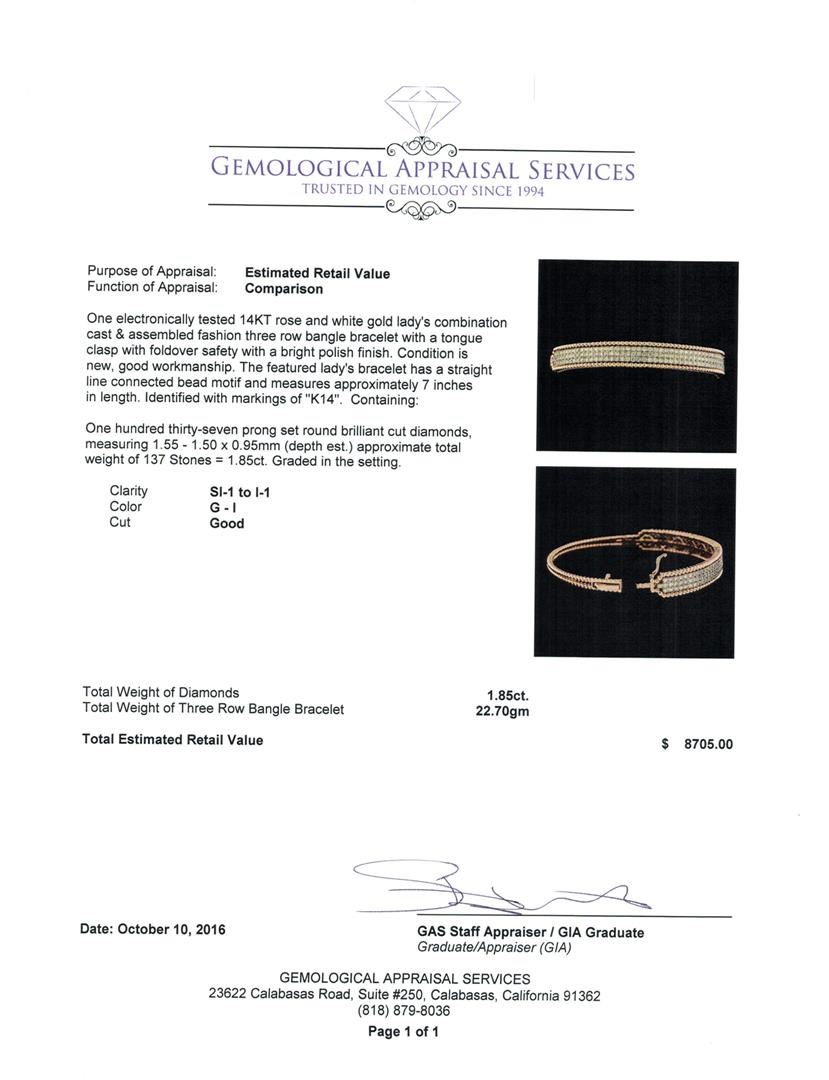 One electronically tested 14KT rose and white gold lady's combination cast & assembled fashion three row bangle bracelet with a tongue clasp with foldover safety with a bright polish finish. The featured lady's bracelet has a straight line connected bead motif and measures approximately 7 inches in length. Identified with markings of 'K14'. Condition is new, good workmanship. Containing: One Hundred Thirty-Seven prong set round brilliant cut diamonds, measuring 1.55 - 1.50 x 0.95mm (depth est.) approximate total weight of 137 Stones = 1.85ct. Graded in the setting. Clarity SI-1 to I-1. Color: G - I Cut Good. Total Weight of Diamonds 1.85ct.. Total Weight of Three Row Bangle Bracelet 22.70gm. GAS Appraised at $8,705.00.