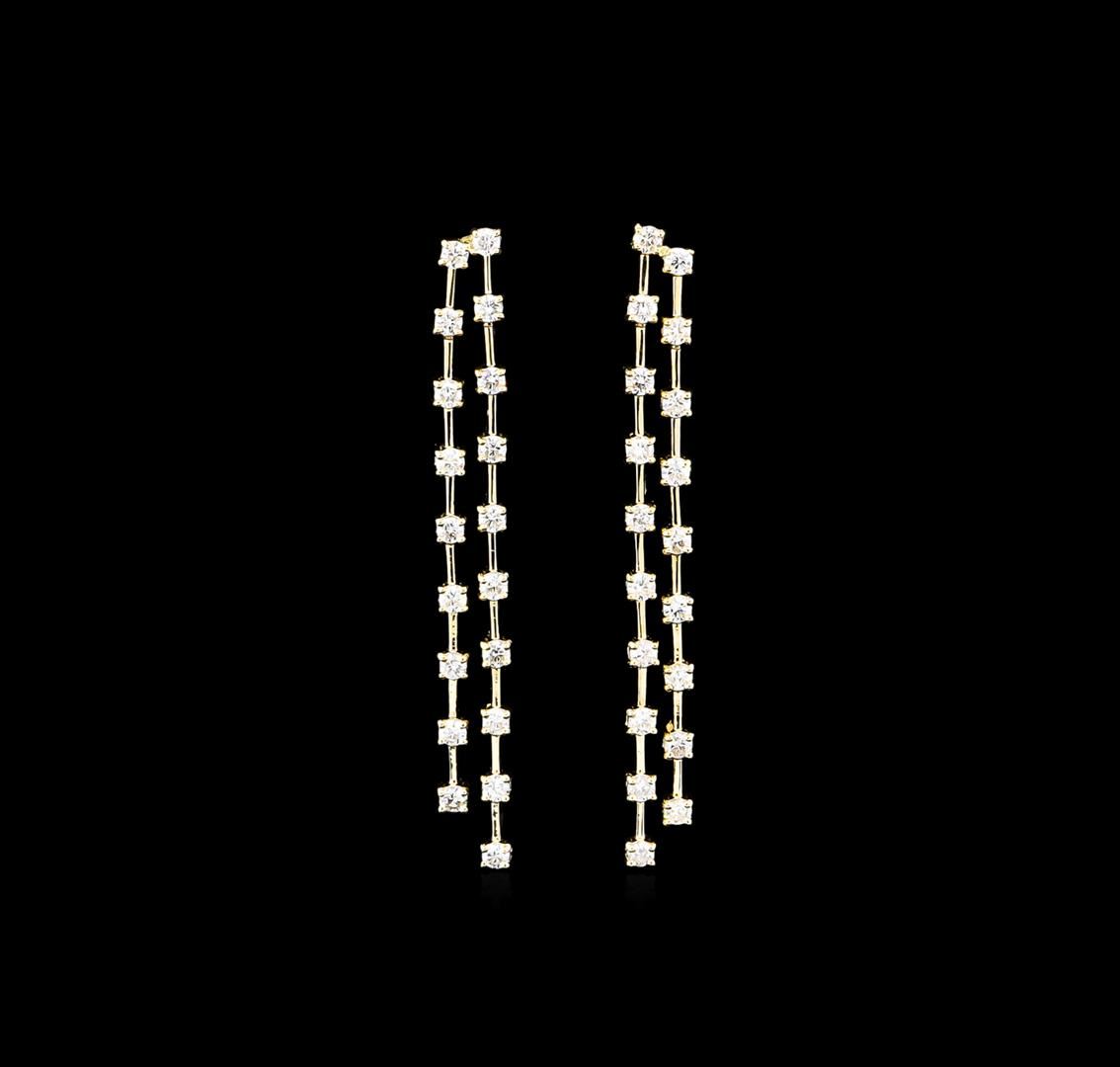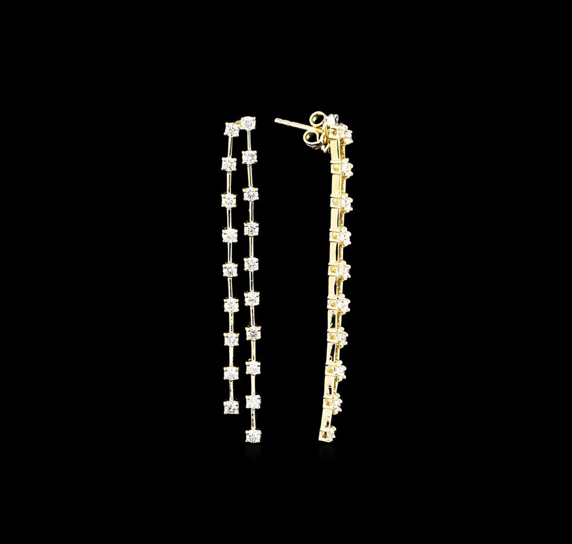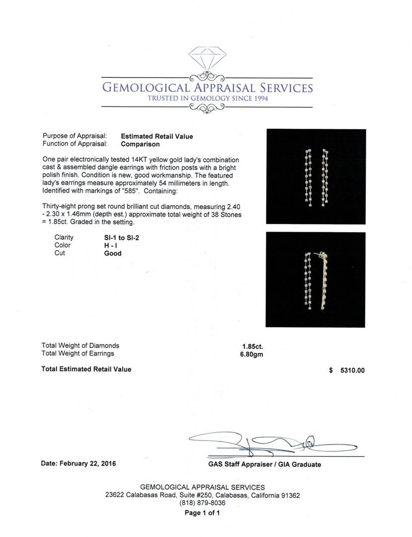 One pair electronically tested 14KT yellow gold lady's combination cast & assembled dangle earrings with friction posts with a bright polish finish. The featured lady's earrings measure approximately 54 millimeters in length. Identified with markings of "585". Condition is new, good workmanship. Containing: Thirty-Eight prong set round brilliant cut diamonds, measuring 2.40 - 2.30 x 1.46mm (depth est.) approximate total weight of 38 Stones = 1.85ct. Graded in the setting. Clarity: SI-1 to SI-2. Color: H - I. Cut Good. Total Weight of Diamonds 1.85ct. Total Weight of Earrings 6.80gm. GAS Appraised at $5,310.00.