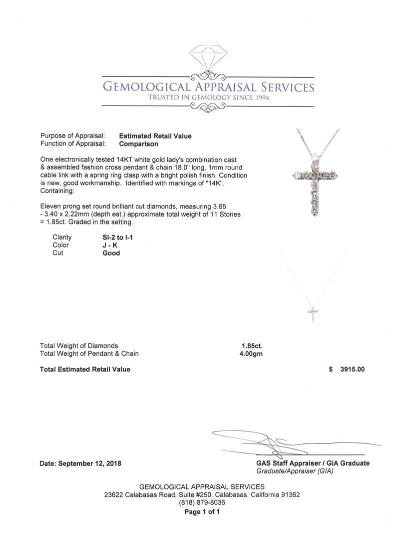 One electronically tested 14KT white gold lady's combination cast & assembled fashion cross pendant & chain 18.0' long, 1mm round cable link with a spring ring clasp with a bright polish finish. Identified with markings of '14K'. Condition is new, good workmanship. Containing: Eleven prong set round brilliant cut diamonds, measuring 3.65 - 3.40 x 2.22mm (depth est.) approximate total weight of 11 Stones = 1.85ct. Graded in the setting. Color J - K Clarity SI-2 to I-1 Cut Good. Total Weight of Diamonds 1.85ct.. Total Weight of Pendant & Chain 4.00gm GAS Appraised at $3915.00. GAS Appraised at $3,915.00.