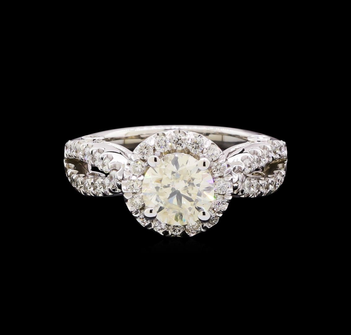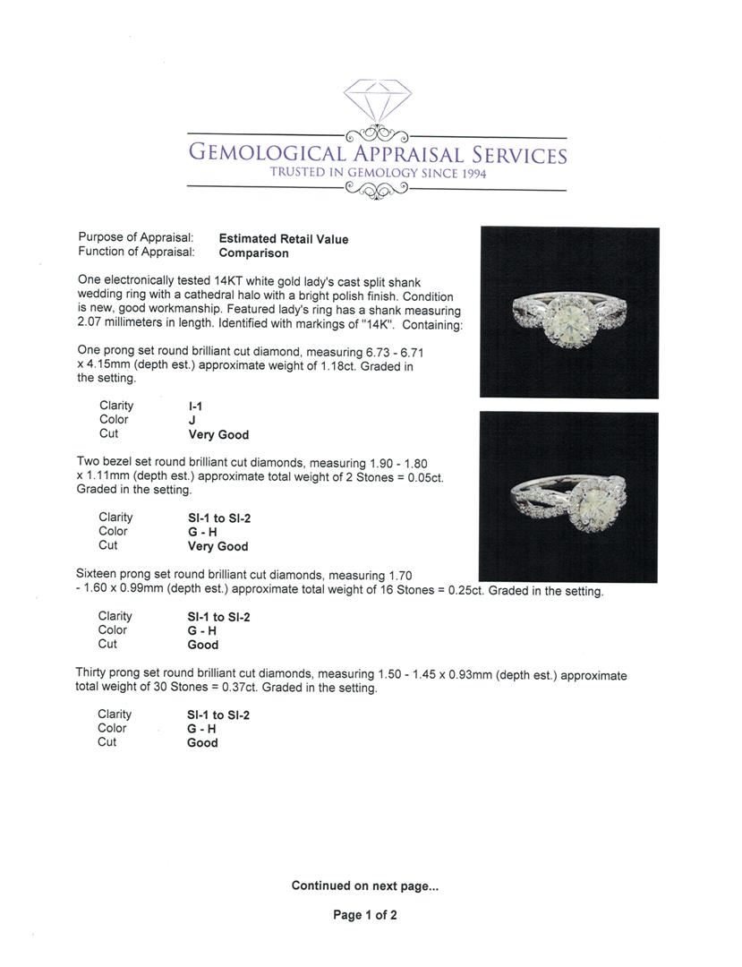 One electronically tested 14KT white gold lady's cast split shank wedding ring with a cathedral halo with a bright polish finish. Featured lady's ring has a shank measuring 2.07 millimeters in width. Identified with markings of "14K". Condition is new, good workmanship. Containing: One prong set round brilliant cut diamond, measuring 6.73 - 6.71 x 4.15mm (depth est.) approximate weight of 1.18ct. Graded in the setting. Clarity: I-1. Color: Very Good Two bezel set round brilliant cut diamonds, measuring 1.90 - 1.80 x 1.11mm (depth est.) approximate total weight of 2 Stones = 0.05ct. Graded in the setting. Clarity: SI-1 to SI-2. Color: G - Very Good Sixteen prong set round brilliant cut diamonds, measuring 1.70 - 1.60 x 0.99mm (depth est.) approximate total weight of 16 Stones = 0.25ct. Graded in the setting. Clarity: SI-1 to SI-2. Color: G - Good Thirty prong set round brilliant cut diamonds, measuring 1.50 - 1.45 x 0.93mm (depth est.) approximate total weight of 30 Stones = 0.37ct. Graded in the setting. Clarity: SI-1 to SI-2. Color: G - Good. Total Weight of Diamonds 1.85ct. Total Weight of Wedding Ring 5.50gm. GAS Appraised at $12,015.00.