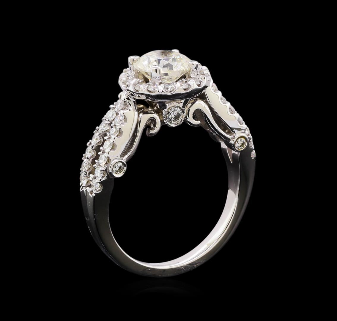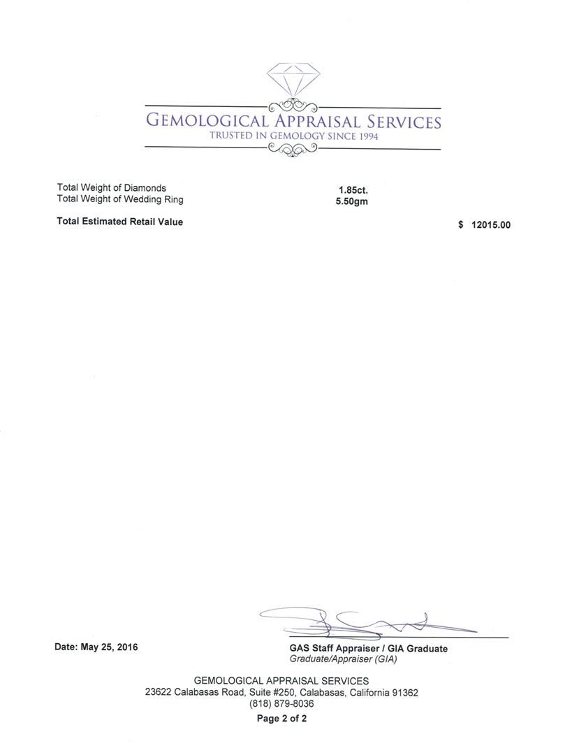 One electronically tested 14KT white gold lady's cast split shank wedding ring with a cathedral halo with a bright polish finish. Featured lady's ring has a shank measuring 2.07 millimeters in width. Identified with markings of "14K". Condition is new, good workmanship. Containing: One prong set round brilliant cut diamond, measuring 6.73 - 6.71 x 4.15mm (depth est.) approximate weight of 1.18ct. Graded in the setting. Clarity: I-1. Color: Very Good Two bezel set round brilliant cut diamonds, measuring 1.90 - 1.80 x 1.11mm (depth est.) approximate total weight of 2 Stones = 0.05ct. Graded in the setting. Clarity: SI-1 to SI-2. Color: G - Very Good Sixteen prong set round brilliant cut diamonds, measuring 1.70 - 1.60 x 0.99mm (depth est.) approximate total weight of 16 Stones = 0.25ct. Graded in the setting. Clarity: SI-1 to SI-2. Color: G - Good Thirty prong set round brilliant cut diamonds, measuring 1.50 - 1.45 x 0.93mm (depth est.) approximate total weight of 30 Stones = 0.37ct. Graded in the setting. Clarity: SI-1 to SI-2. Color: G - Good. Total Weight of Diamonds 1.85ct. Total Weight of Wedding Ring 5.50gm. GAS Appraised at $12,015.00.