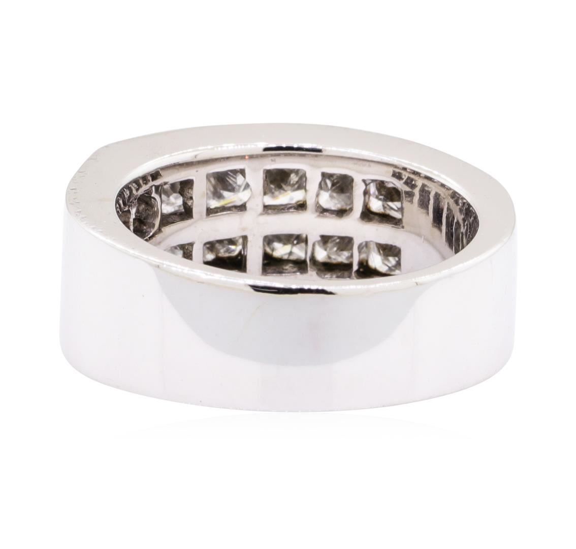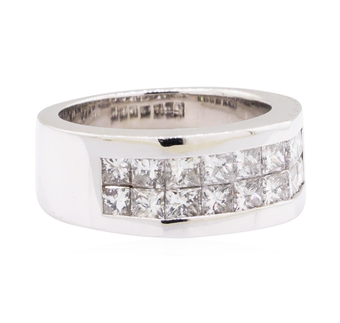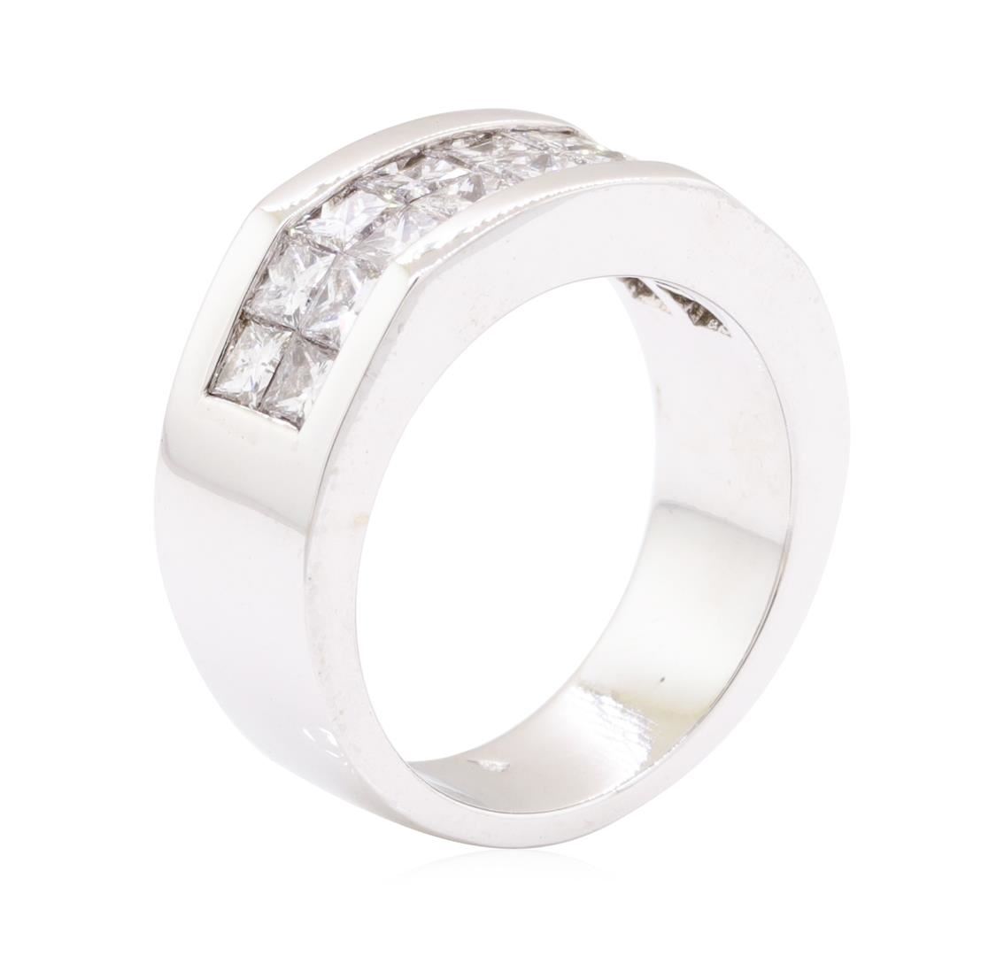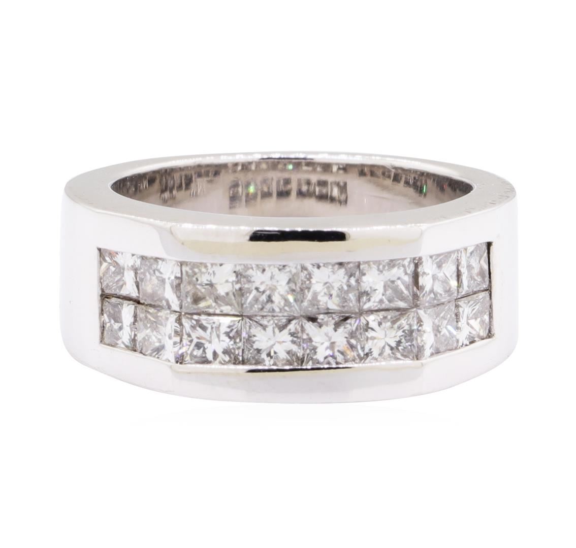 One electronically tested 14KT white gold lady's cast fashion ring with a two row channel with a bright polish finish. The featured lady's ring has a shank measuring 5.67 millimeters wide. Identified with markings of '14K'. Condition is new, good workmanship. Containing: Sixteen invisible set princess cut diamonds, measuring 2.80 x 2.60 x 1.96mm (depth est.) approximate total weight of 16 Stones = 1.85ct. Graded in the setting. Color H - I Clarity SI-1 to I-1 Cut Very Good. Total Weight of Diamonds 1.85ct.. Total Weight of Ring 8.30gm GAS Appraised at $4390.00. GAS Appraised at $4,390.00.