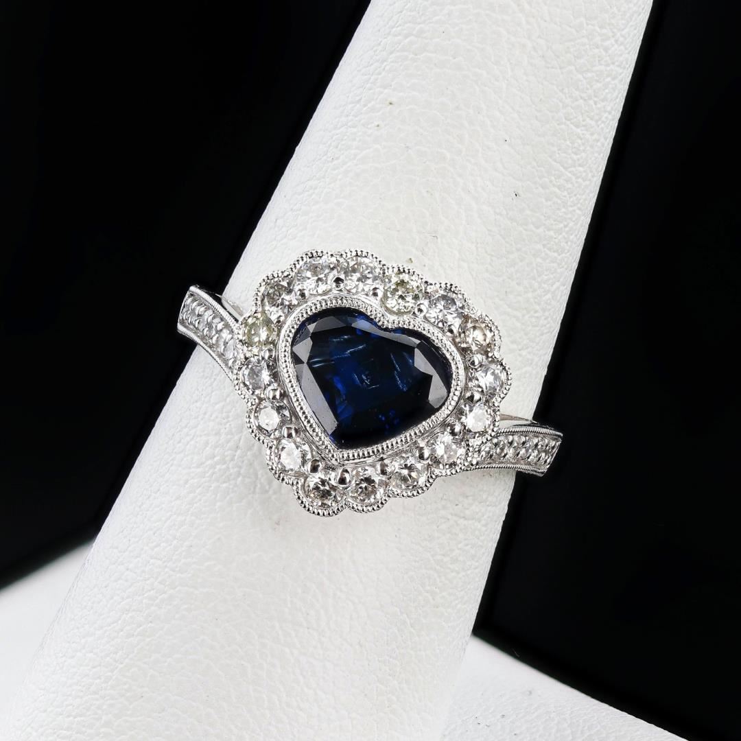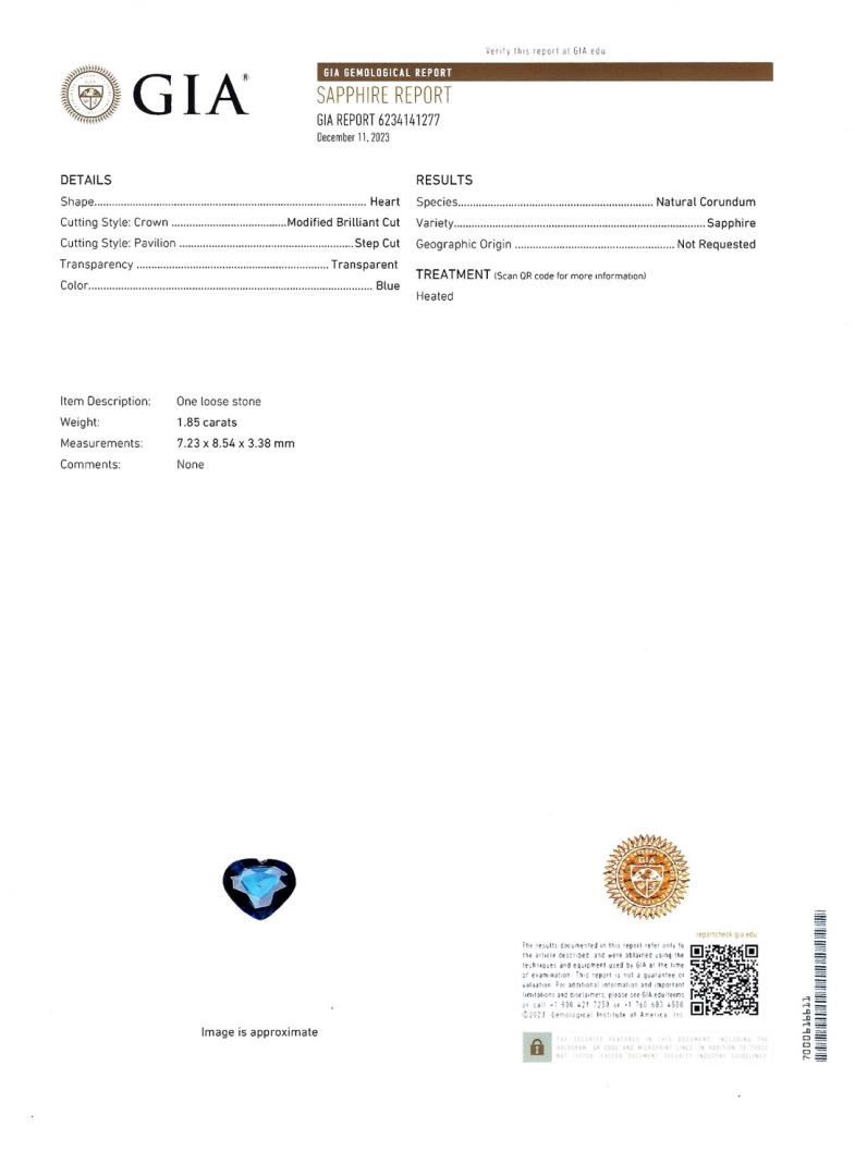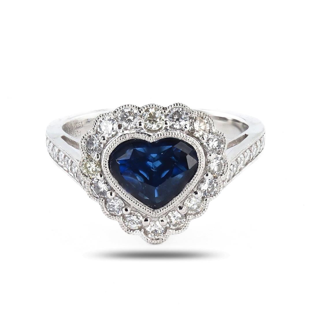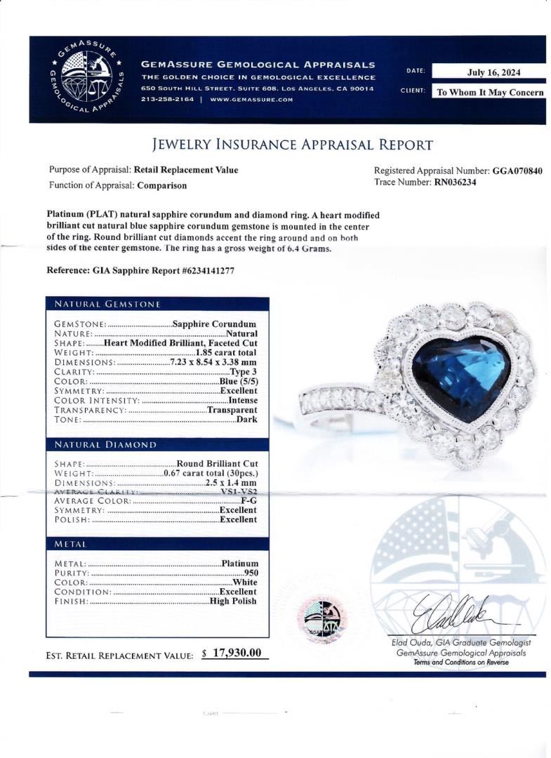 Platinum (PLAT) natural sapphire corundum and diamond ring. A heart modified brilliant cut natural blue sapphire corundum gemstone is mounted in the center of the ring. Round brilliant cut diamonds accent the ring around and on both sides of the center gemstone. The ring has a gross weight of 6.4 Grams. Reference: GIA Sapphire Report #6234141277 Brand: Oscar Friedman #NATURAL GEMSTONE# GEMSTONE: Sapphire Corundum NATURE: Natural SHAPE: Heart Modified Brilliant, Faceted Cut WEIGHT: 1.85 carat total DIMENSIONS: 1.23 x 8.54 x 3.38mm CLARITY: Type 3 COLOR: Blue (5/5) SYMMETRY: Excellent COLOR INTENSITY: Intense TRANSPARENCY: Transparent TONE: Dark #NATURAL DIAMOND# SHAPE: Round Brilliant Cut WEIGHT: 0.67 carat total (30pcs.) DIMENSIONS: 2.5 x 1.4mm AVERAGE CLARITY: VS1-VS2 AVERAGE COLOR: F-G SYMMETRY: Excellent POLISH: Excellent #METAL# METAL: Platinum PURITY: 950 COLOR: White CONDITION: Excellent FINISH: High Polish Size: 6 3/4