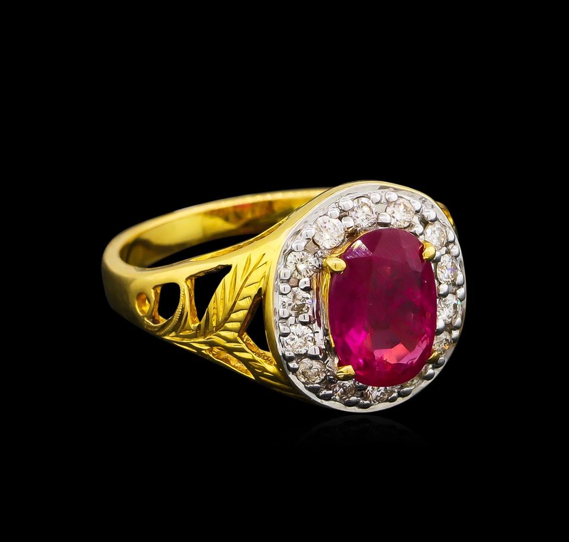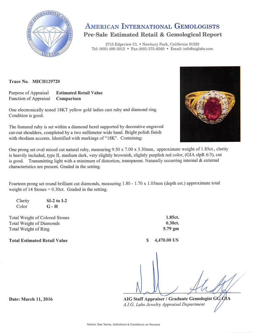 One electronically tested 18KT yellow gold ladies cast ruby and diamond ring. The featured ruby is set within a diamond bezel supported by decorative engraved cut-out shoulders, completed by a two millimeter wide band. Bright polish finish with rhodium accents. Identified with markings of "18K". Condition is good. Containing: One prong set oval mixed cut natural ruby, measuring 9.50 x 7.00 x 3.30mm, approximate weight of 1.85ct., clarity is heavily included, type II, medium dark, very slightly brownish, slightly purplish red color, (GIA slpR 6/3), cut is good. Transmitting light with a minimum of distortion, transparent. Naturally occurring internal & external characteristics are present. Graded in the setting. Fourteen prong set round brilliant cut diamonds, measuring 1.80 - 1.70 x 1.05mm (depth est.) approximate total weight of 14 Stones = 0.30ct. Graded in the setting. Clarity: SI-2 to I-2. Color: G - H. Total Weight of Colored Stones 1.85ct. Total Weight of Diamonds 0.30ct. Total Weight of Ring 5.79gm. AIG Appraised at $4,470.00.