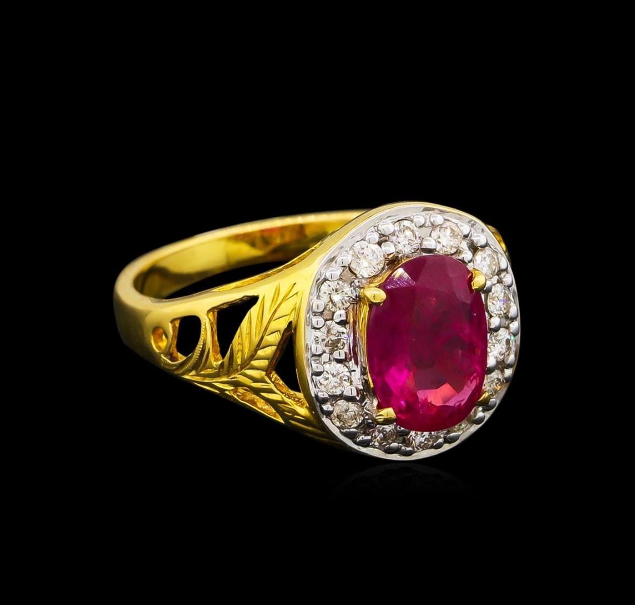 One electronically tested 18KT yellow gold ladies cast ruby and diamond ring. The featured ruby is set within a diamond bezel supported by decorative engraved cut-out shoulders, completed by a two millimeter wide band. Bright polish finish with rhodium accents. Identified with markings of "18K". Condition is good. Containing: One prong set oval mixed cut natural ruby, measuring 9.50 x 7.00 x 3.30mm, approximate weight of 1.85ct., clarity is heavily included, type II, medium dark, very slightly brownish, slightly purplish red color, (GIA slpR 6/3), cut is good. Transmitting light with a minimum of distortion, transparent. Naturally occurring internal & external characteristics are present. Graded in the setting. Fourteen prong set round brilliant cut diamonds, measuring 1.80 - 1.70 x 1.05mm (depth est.) approximate total weight of 14 Stones = 0.30ct. Graded in the setting. Clarity: SI-2 to I-2. Color: G - H. Total Weight of Colored Stones 1.85ct. Total Weight of Diamonds 0.30ct. Total Weight of Ring 5.79gm. AIG Appraised.